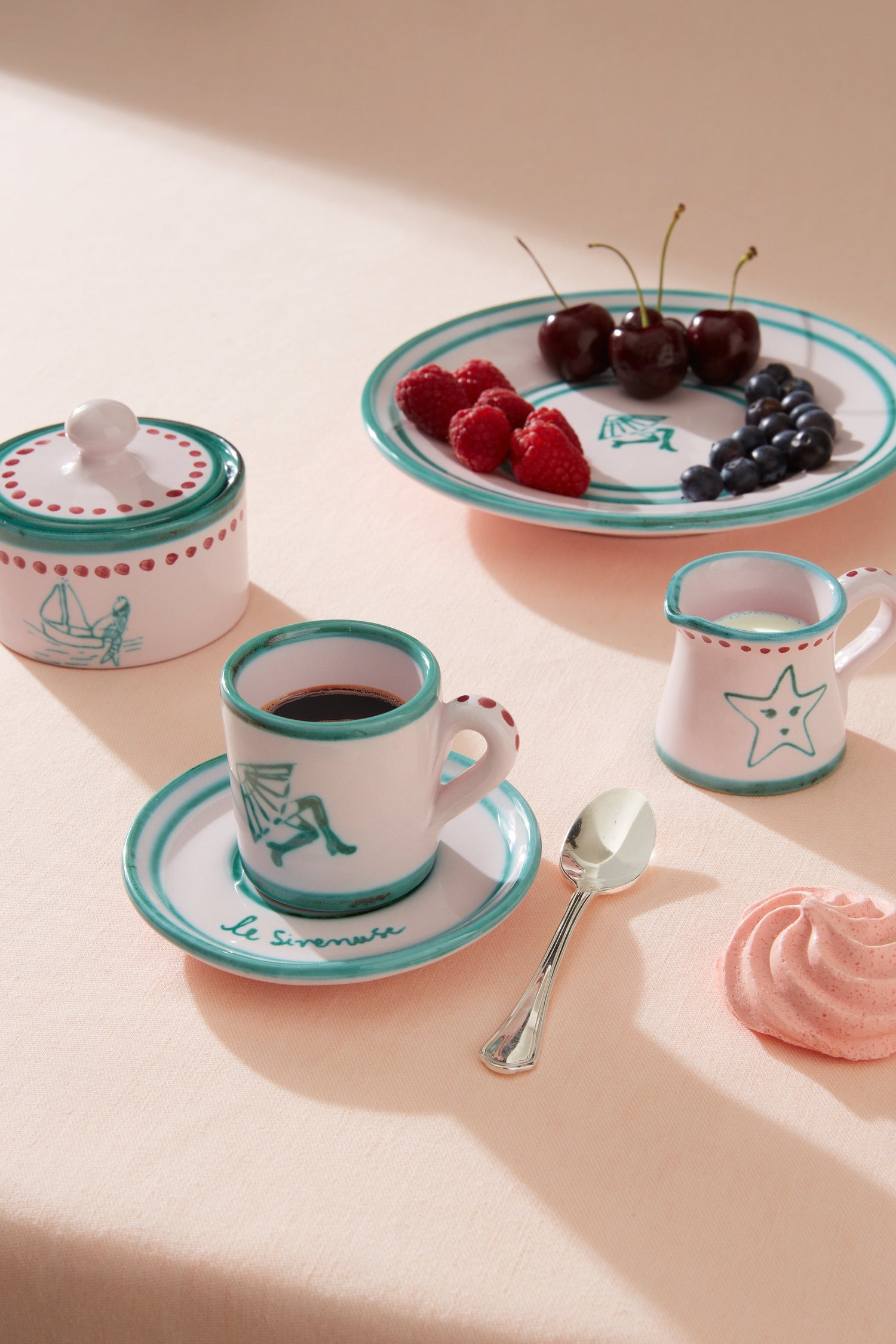 Emporio Sirenuse's 'By The Pool' tableware collection showcases six whimsical drawings by Cornish artist Lucy Stein, featured during lunch service at the Pool Bar of Le Sirenuse Hotel. Hand-crafted by Vietri Scotto artisans in Vietri sul Mare, a small town on the Amalfi Coast, each piece is a work of art.