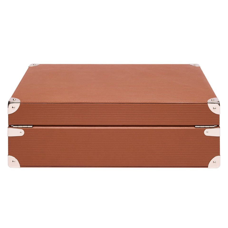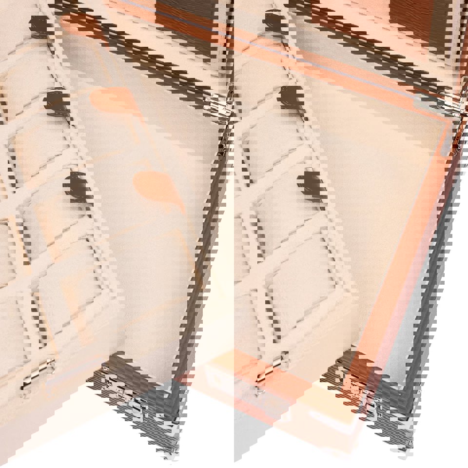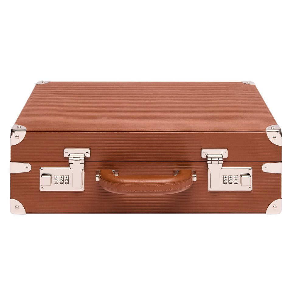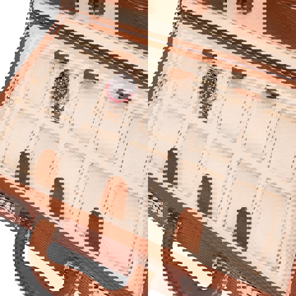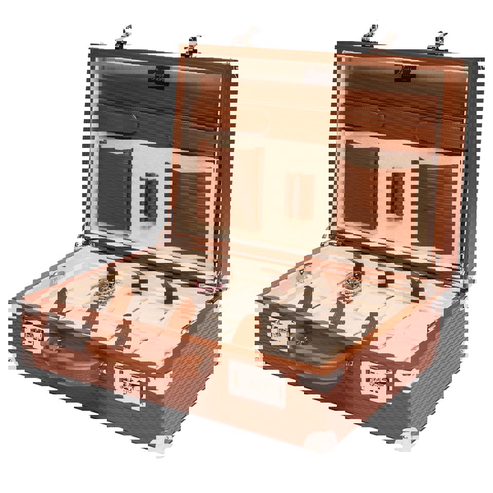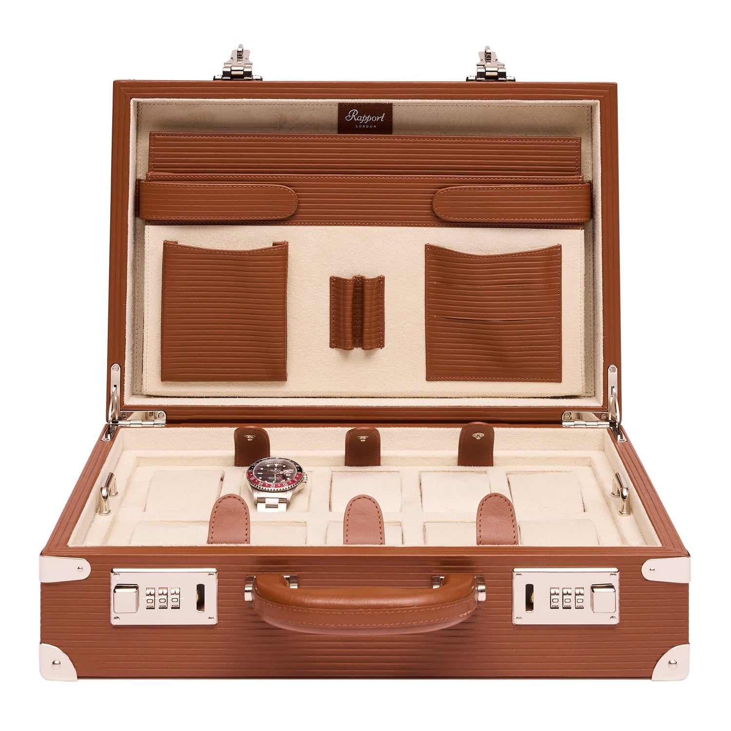 The Nova Briefcase designed to hold ten watches combines exquisite craftsmanship and functionality. Crafted from the finest quality materials, the linear leather exterior is stitched and finished to perfection, with premium locks, hinges and handles. The interior is designed to accommodate ten timepieces securely, each watch with its own compartments lined in soft suede to protect from damage. To protect the watches within, the briefcase is designed with robust security measures using a locking mechanism.
