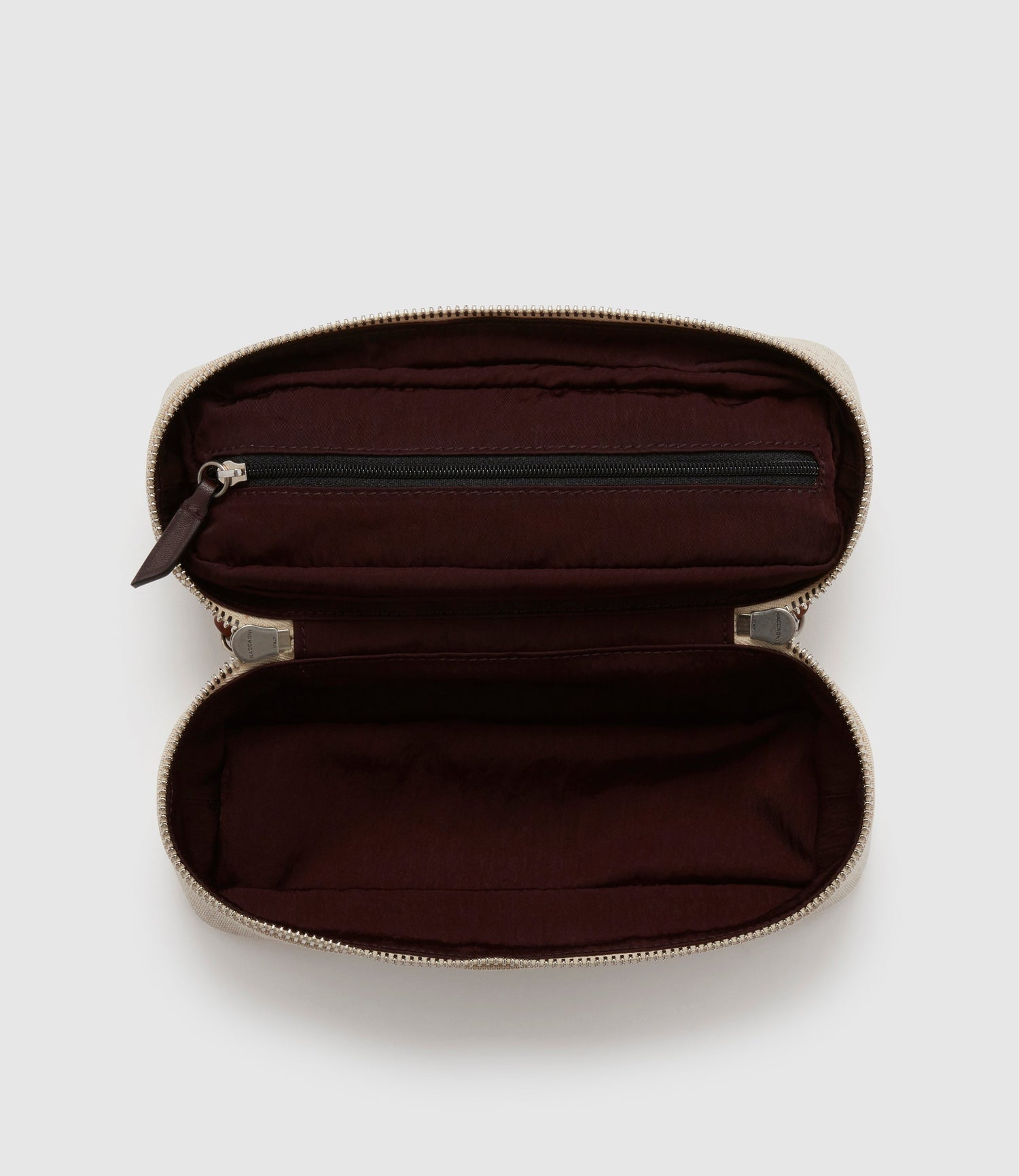 The One Day Toiletry Bag elegantly holds your daily necessities. With a waterproof cloth interior, it also features a water-resistant exterior and a zippered compartment under its lid to separate smaller items.