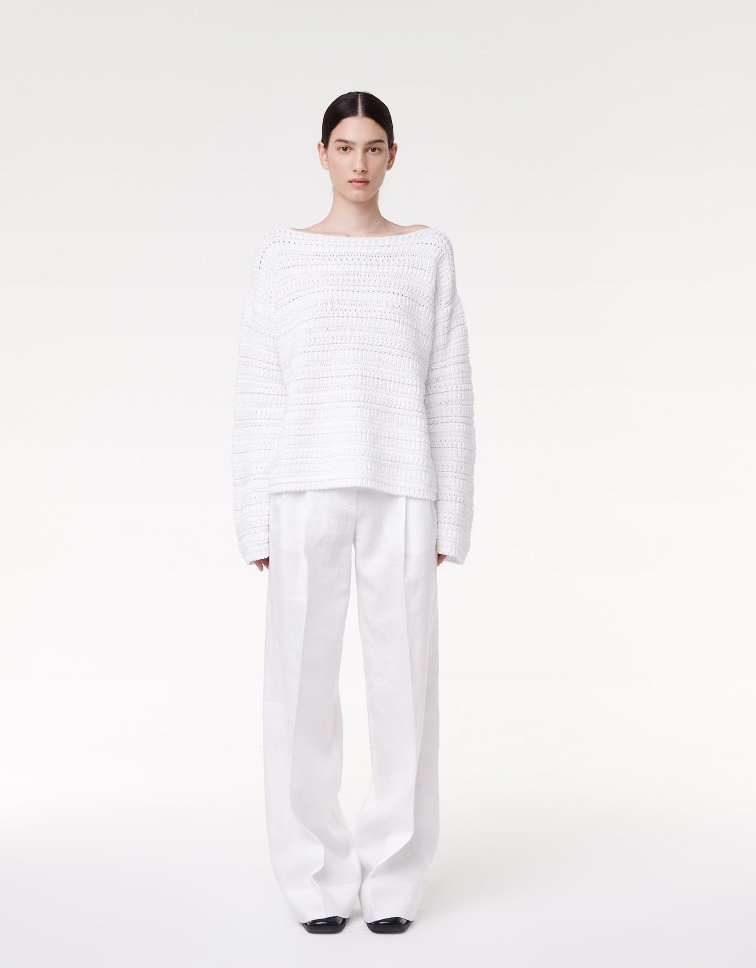 With an oversized fit and wide neckline, this sweater is the perfect added layer for transitional weather dressing.