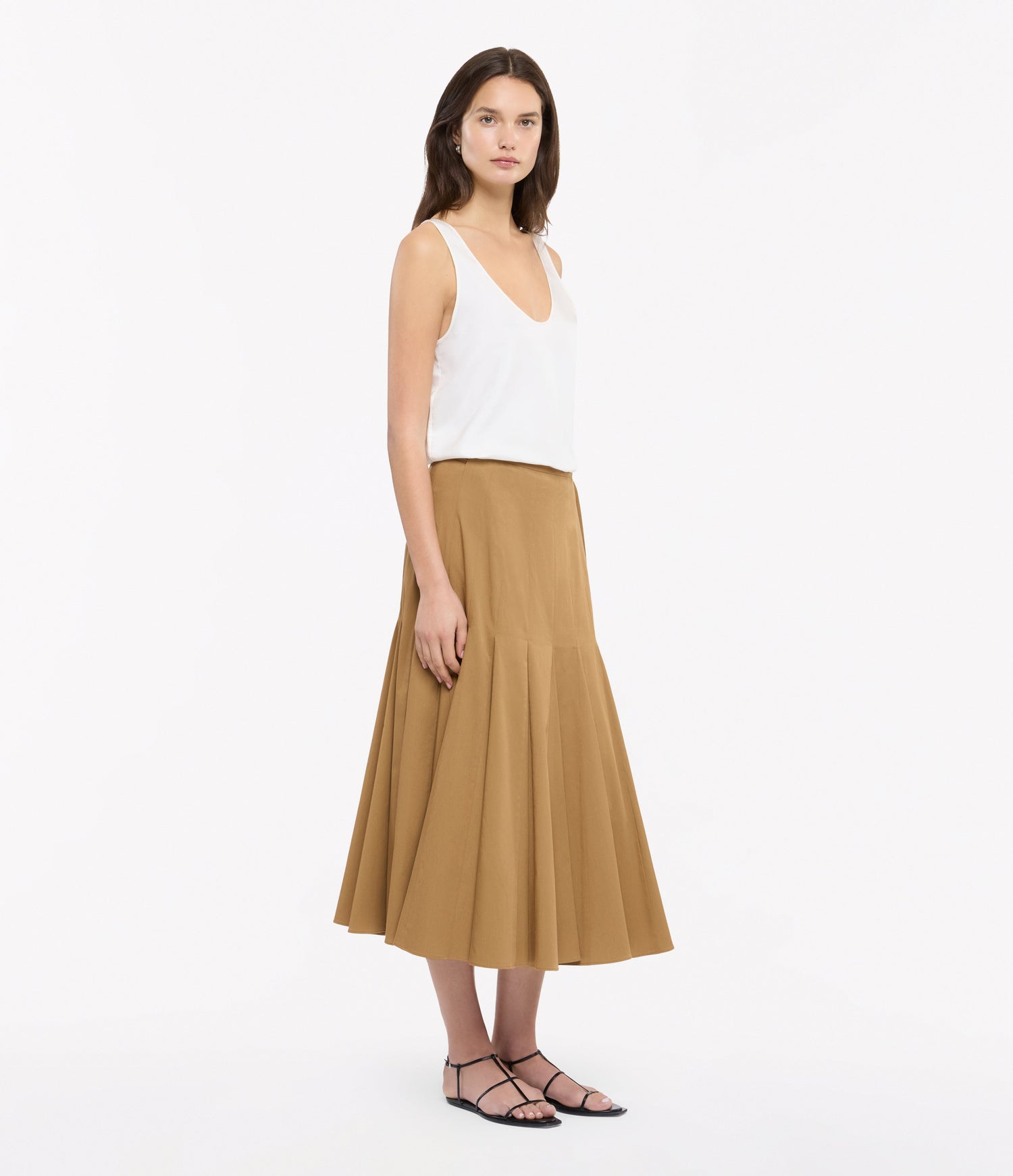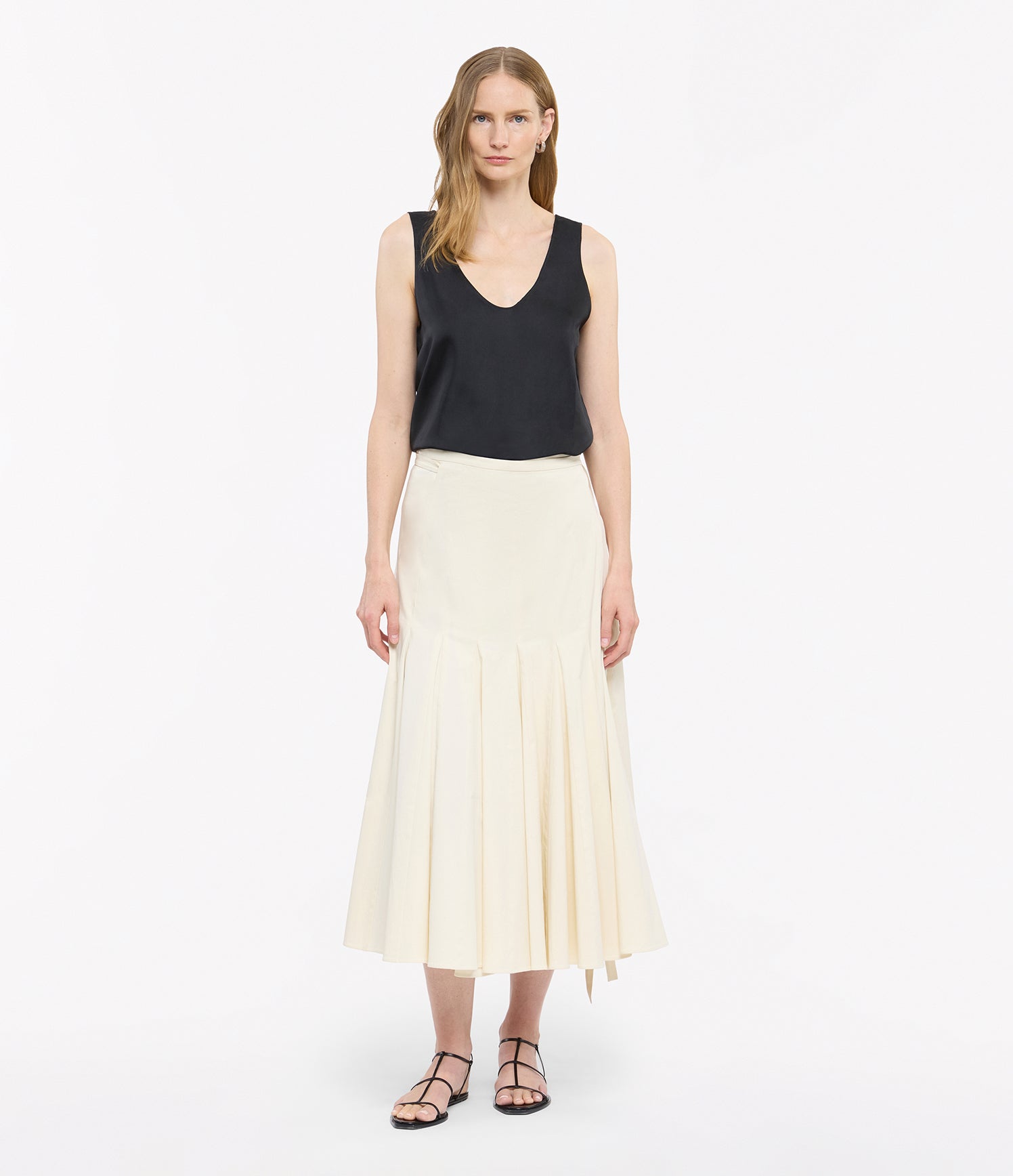 Crafted in lightweight organic cotton with a crisp feel, this mid length skirt has a detachable belt at the waist. Featuring impeccable pleating, creating subtle volume from the mid thigh down.