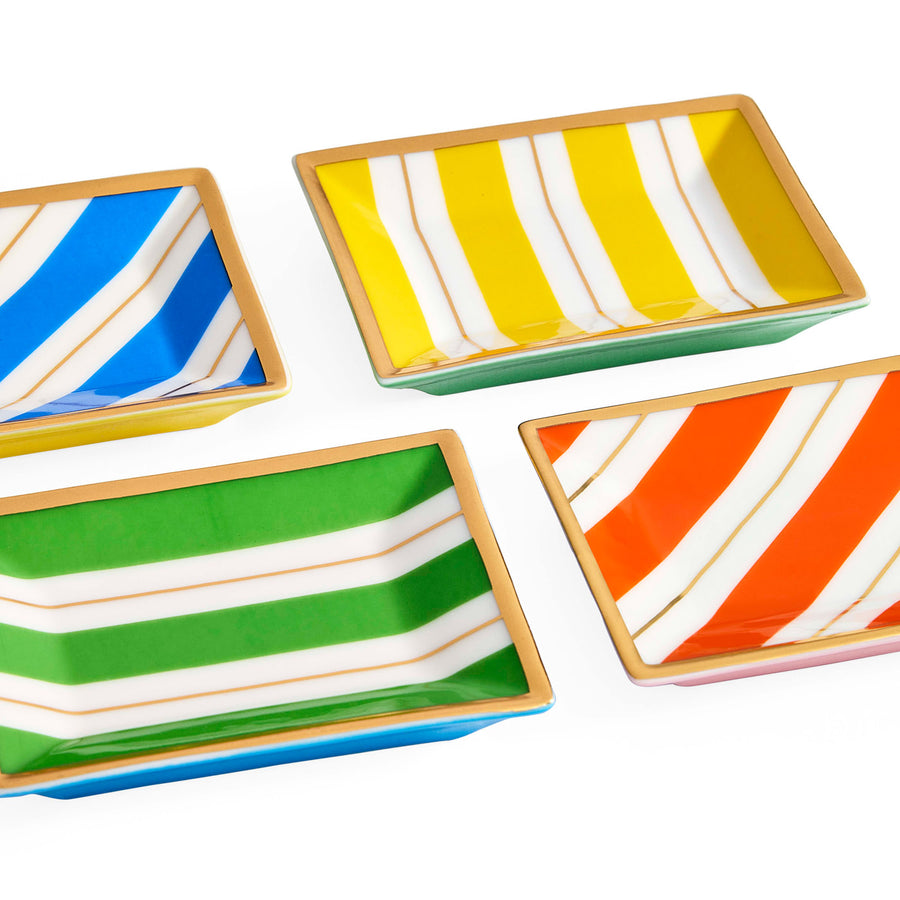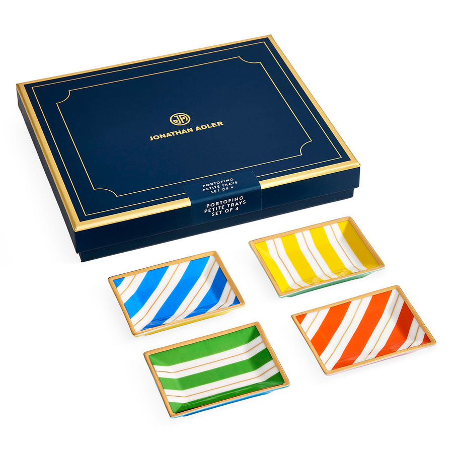 A touch of Italian Riviera charm—served in style. The Portofino Petite Tray Set features four high-gloss lacquer trays, each adorned with colorful geometric motifs. Perfect for corralling keys, jewelry, bar tools, or hors d'oeuvres, these trays are as functional as they are beautiful. Their petite size makes them endlessly versatile, adding a polished pop of pattern wherever they're placed—be it an entryway, vanity, or cocktail table.