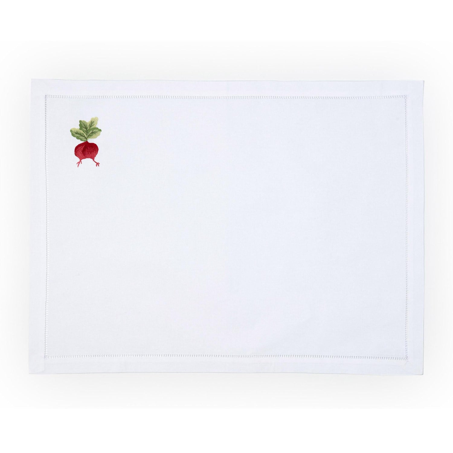 Radish embroidered placemat finished with antique hemstitch. 100% cotton. Made in Turkey.