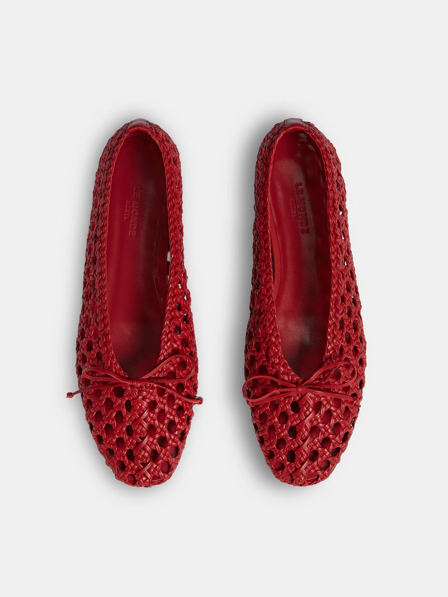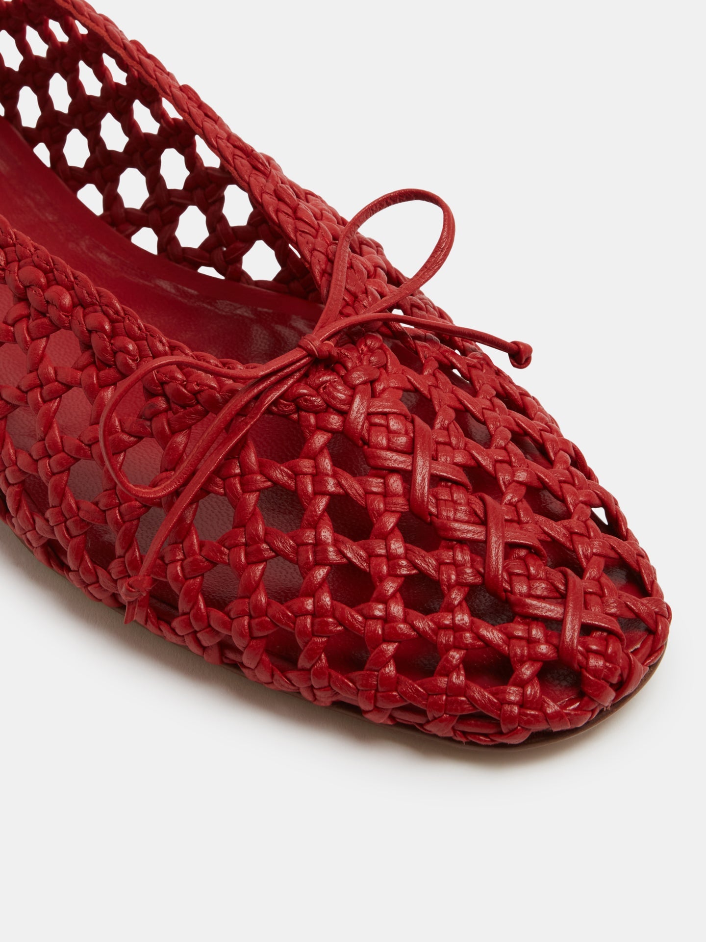 Regency Slipper in crimson woven leather with a bow detail, and cushioned calf leather insole. 8mm heel. Made in Italy.