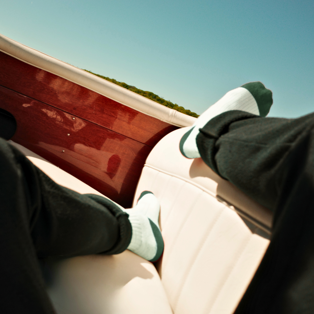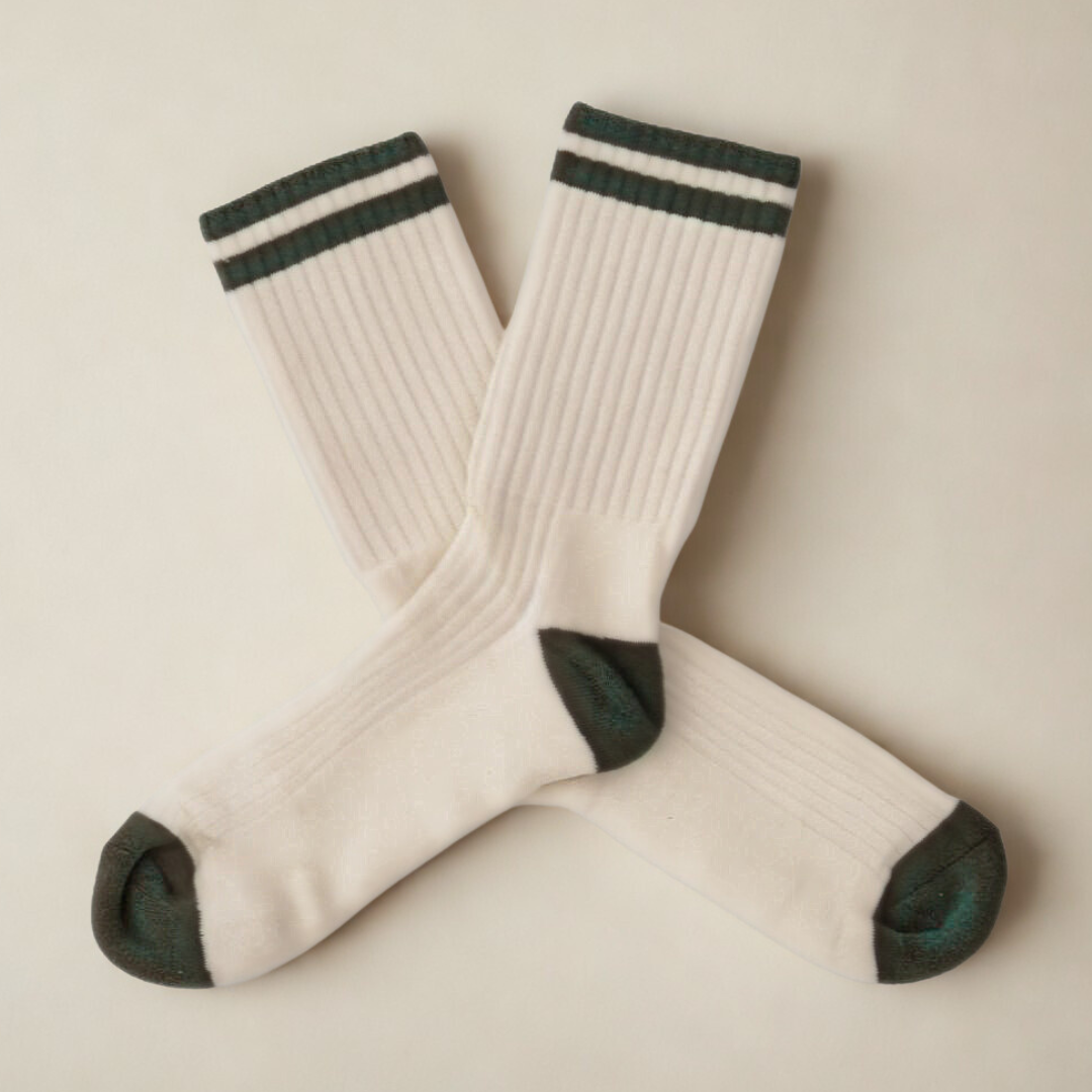 The Retro Gym Sock in Vintage White with Forest Stripes brings a refined twist to classic athleticwear. Clean and nostalgic, the vintage white base is accented by rich forest green stripes—a subtle nod to prep-school charm and varsity cool. Crafted in Italy from a soft, breathable cotton blend and finished with ribbed detailing, this mid-calf sock is built for comfort, style, and repeat wear.
