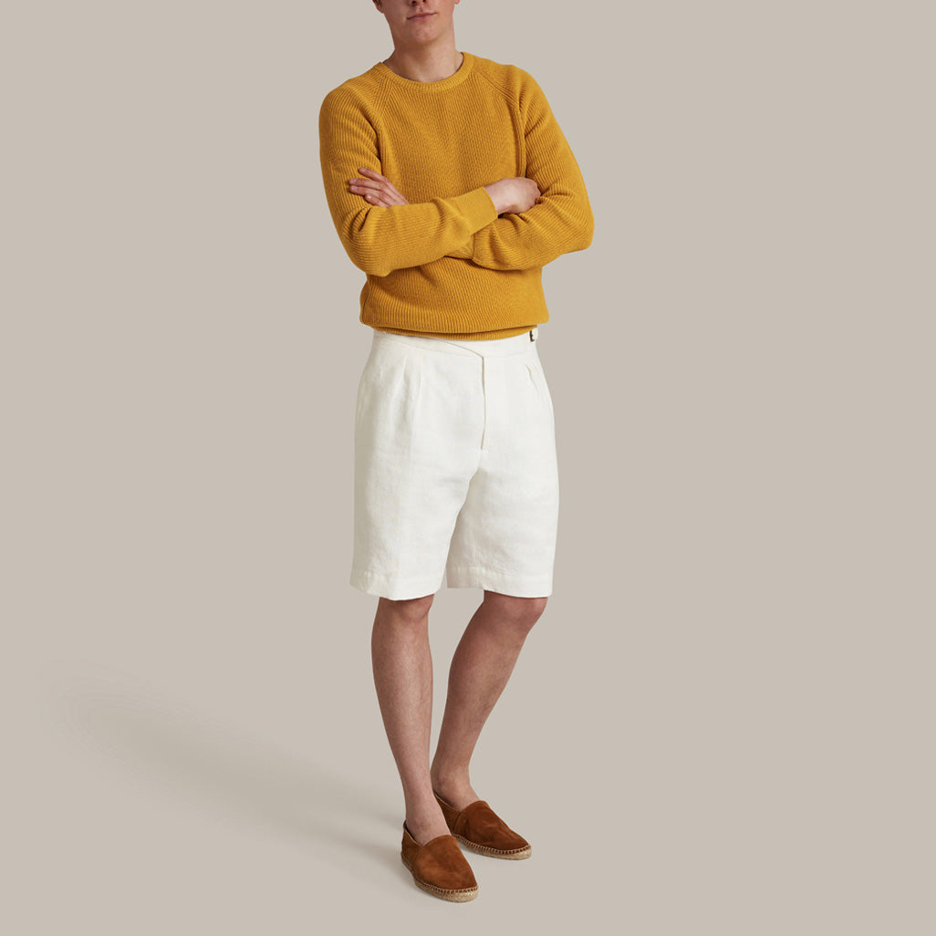 This mid-weight cotton sweater features a ribbed knit and subtle raglan shoulder detail. It is an incredibly versatile piece as its weight means it can be worn throughout the winter as an alternative to wool. Worn with lightweight trousers or shorts in the summer, it is a sweater you will reach for time and time again.
