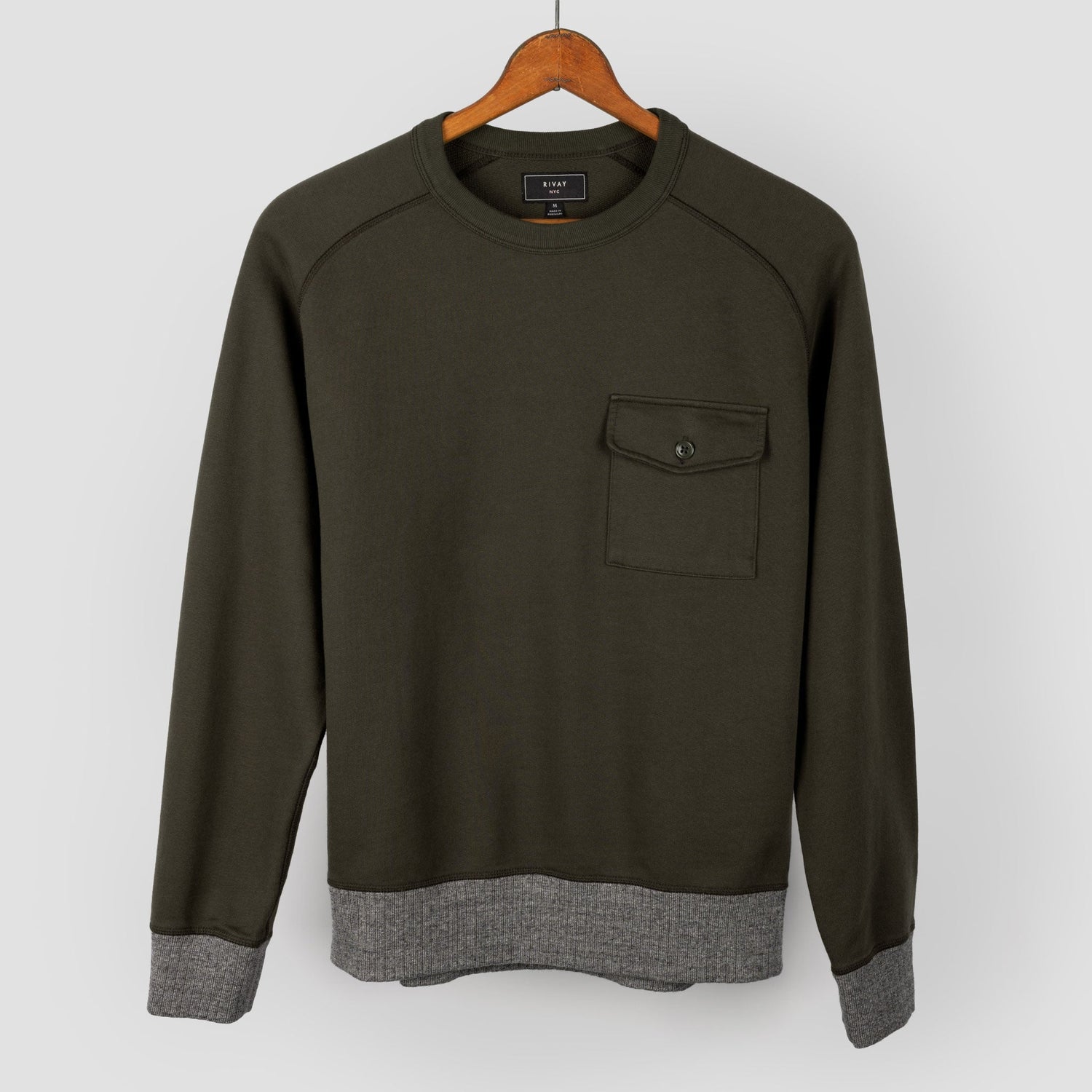 This slim-fit sweater—made from olive-colored French Terry cotton and finished with a chest utility pocket—is equal parts relaxed and refined.