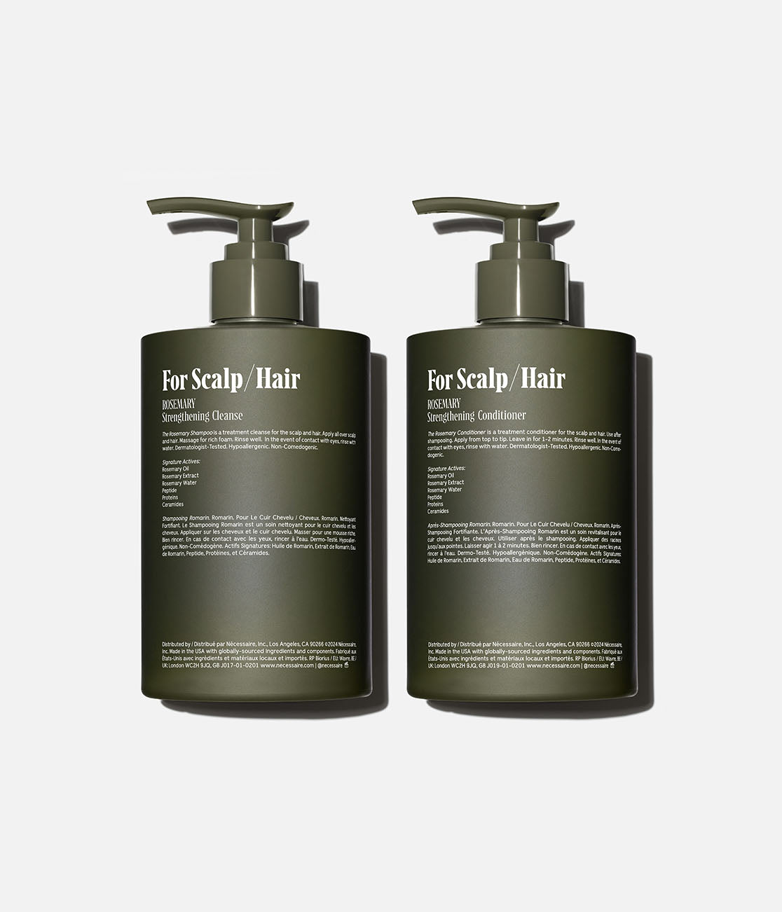The Rosemary Hair Duo is a 2-step strengthening duo for the hair. The Rosemary Shampoo and Rosemary Conditioner are infused with Pure Essential Rosemary Oil, Plant Proteins (Rice/Jojoba/Quinoa/Potato/Pea) and Essential Ceramides (AG/AP/EOP/NG/NP). Pure Essential Rosemary Oil helps stimulate the scalp, while Plant Proteins and Ceramides help strengthen the hair shaft and reduce hair breakage. This duo also contains a micro-dose of the powerful hair peptide - Capixyl™. All ingredients are uniquely delivered in gentle, clean formulas for a non-stripping, non-drying experience. The signature scent of Rosemary pairs Fine Fragrance notes of Rosemary, Mandarin, Jasmine, and Cedar for the best in sensory. Dermatologist-Tested. Hypoallergenic. Non-Comedogenic. Color-Safe. Keratin-Safe.
