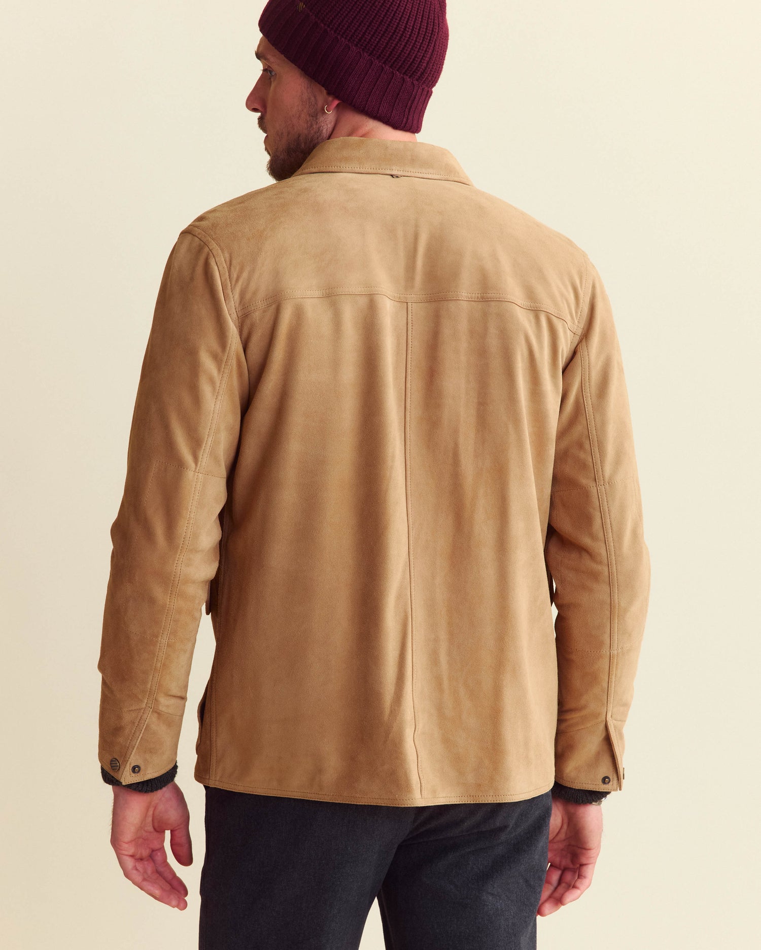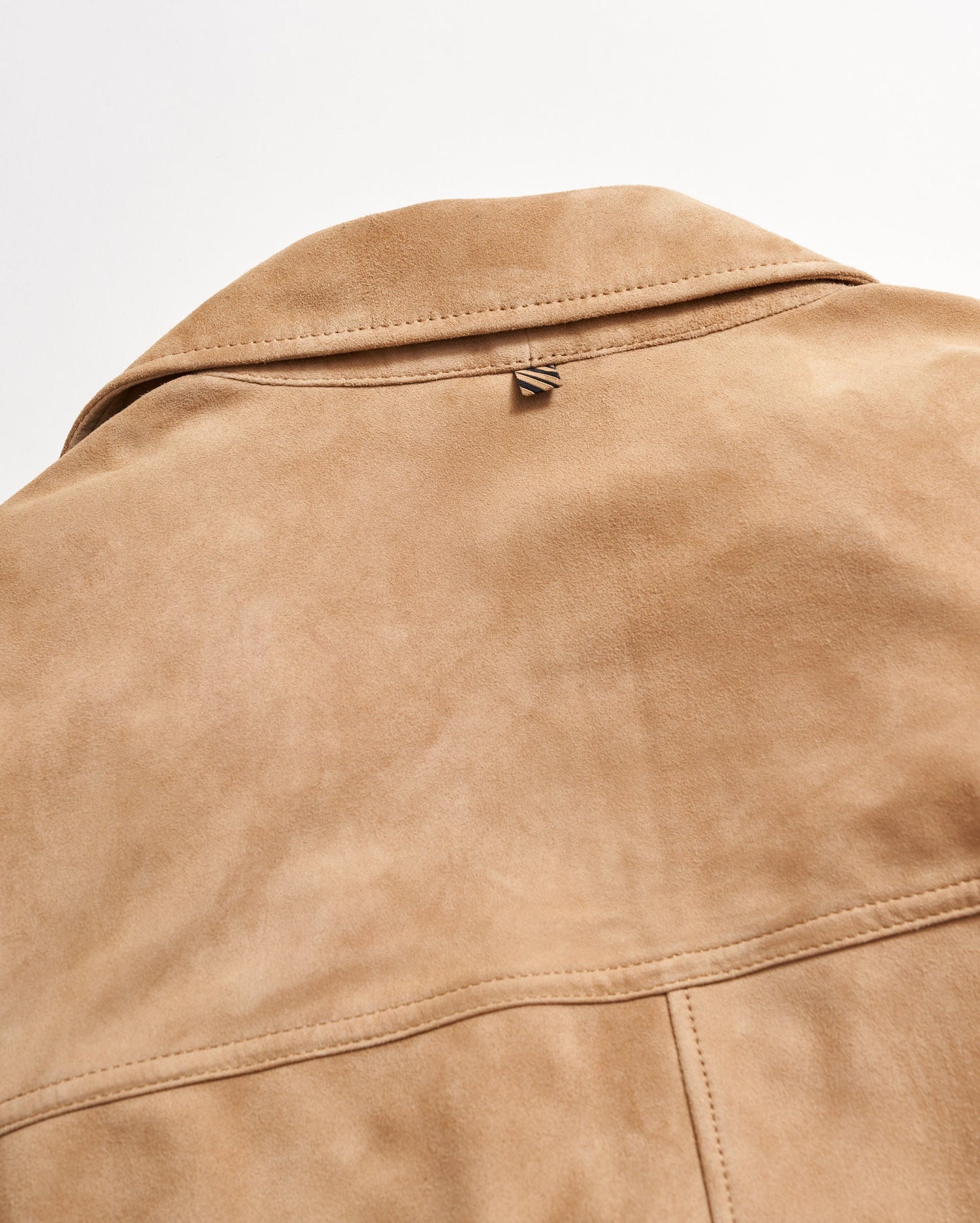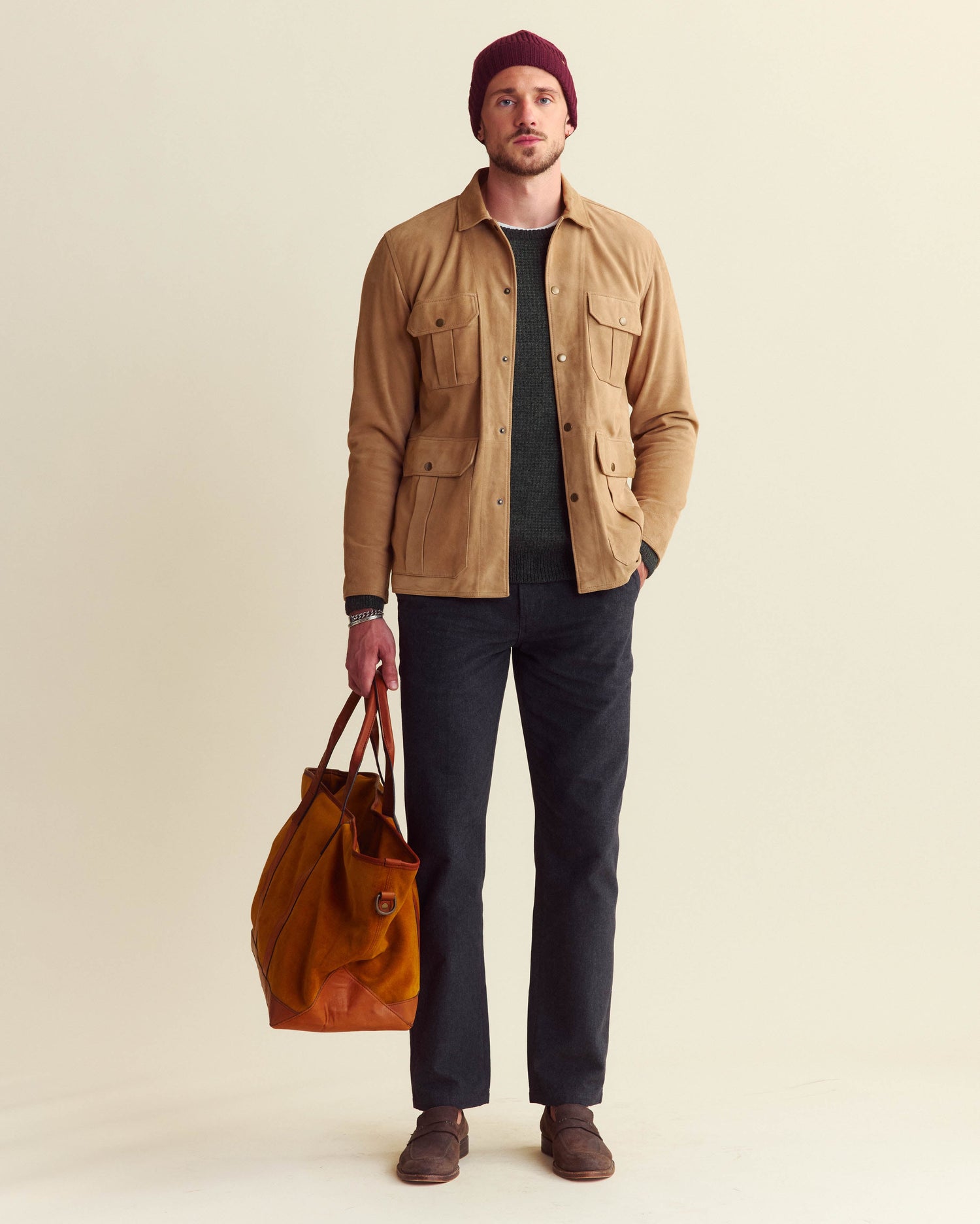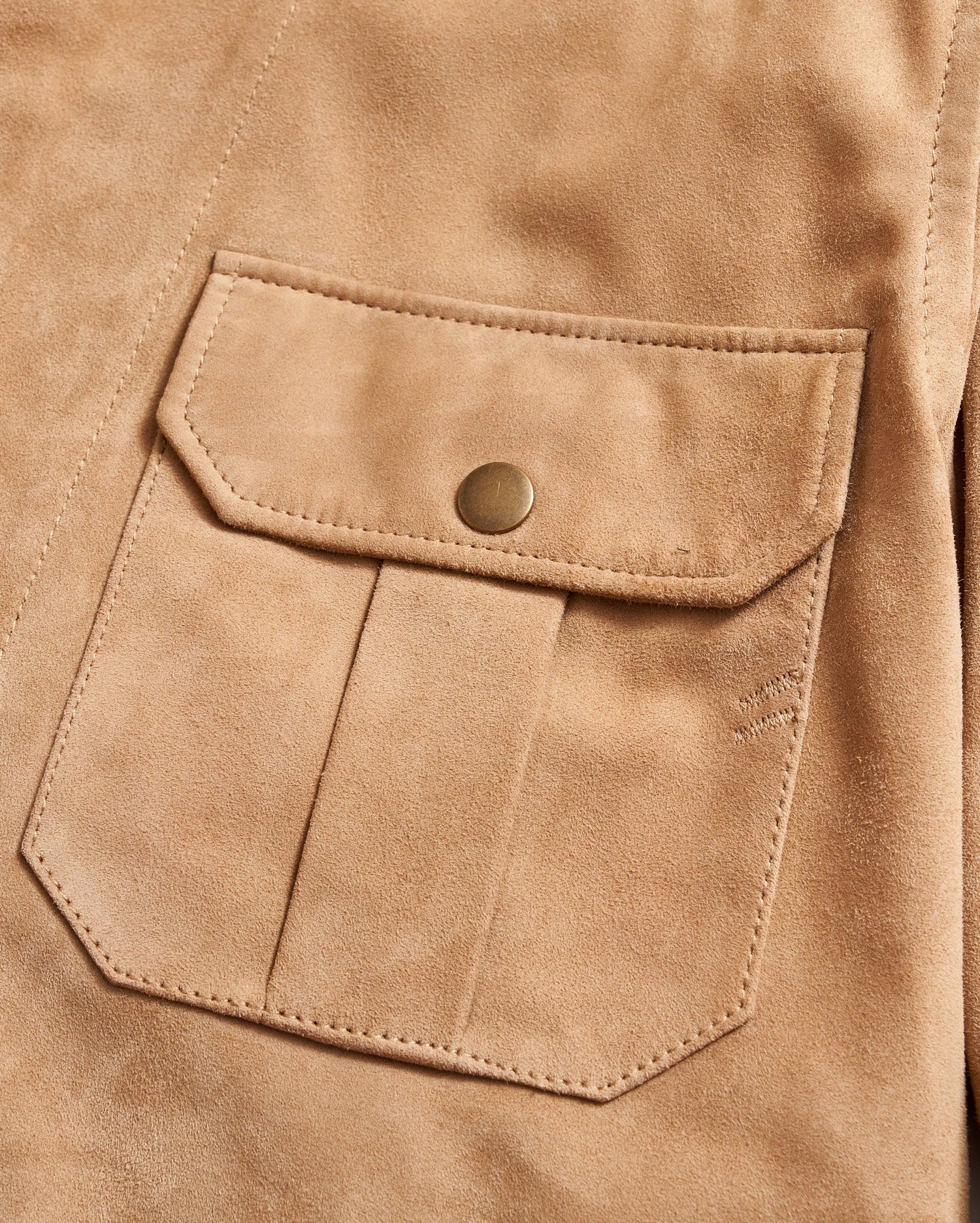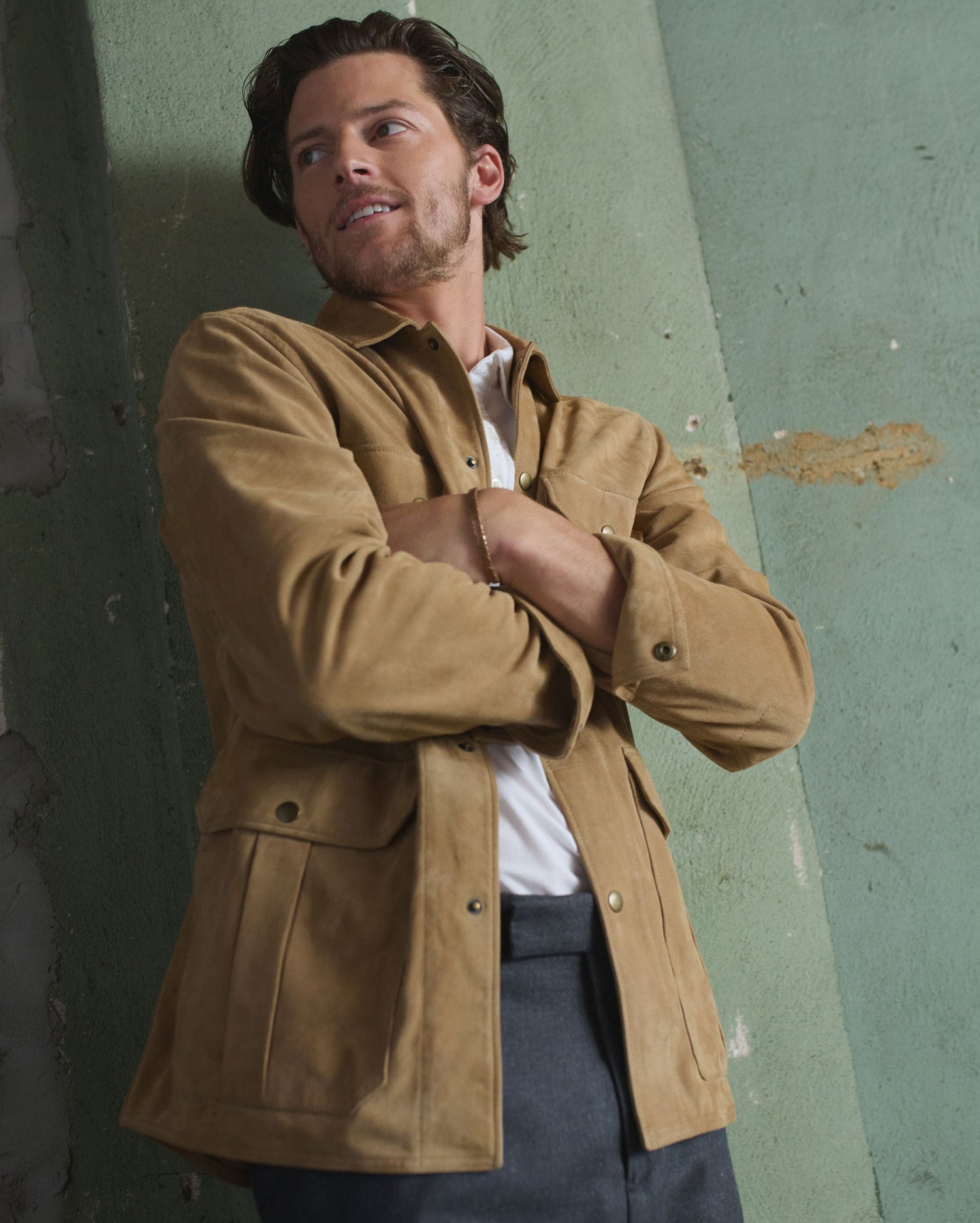 A modern take on an iconic menswear utilitarian piece, Billy Reid's Safari Jacket is crafted from a handsome, butter-soft goat suede and finished with classic pleated bellow pockets that feature a side entry of the bottom pockets. Thoughtful design details include beautiful antique brass snaps, snaps branded with our signature heirloom ribbon stripe at the cuff, and our heirloom ribbon stripe clamshell at the back neck. It's an heirloom-quality piece that will only get better with time.