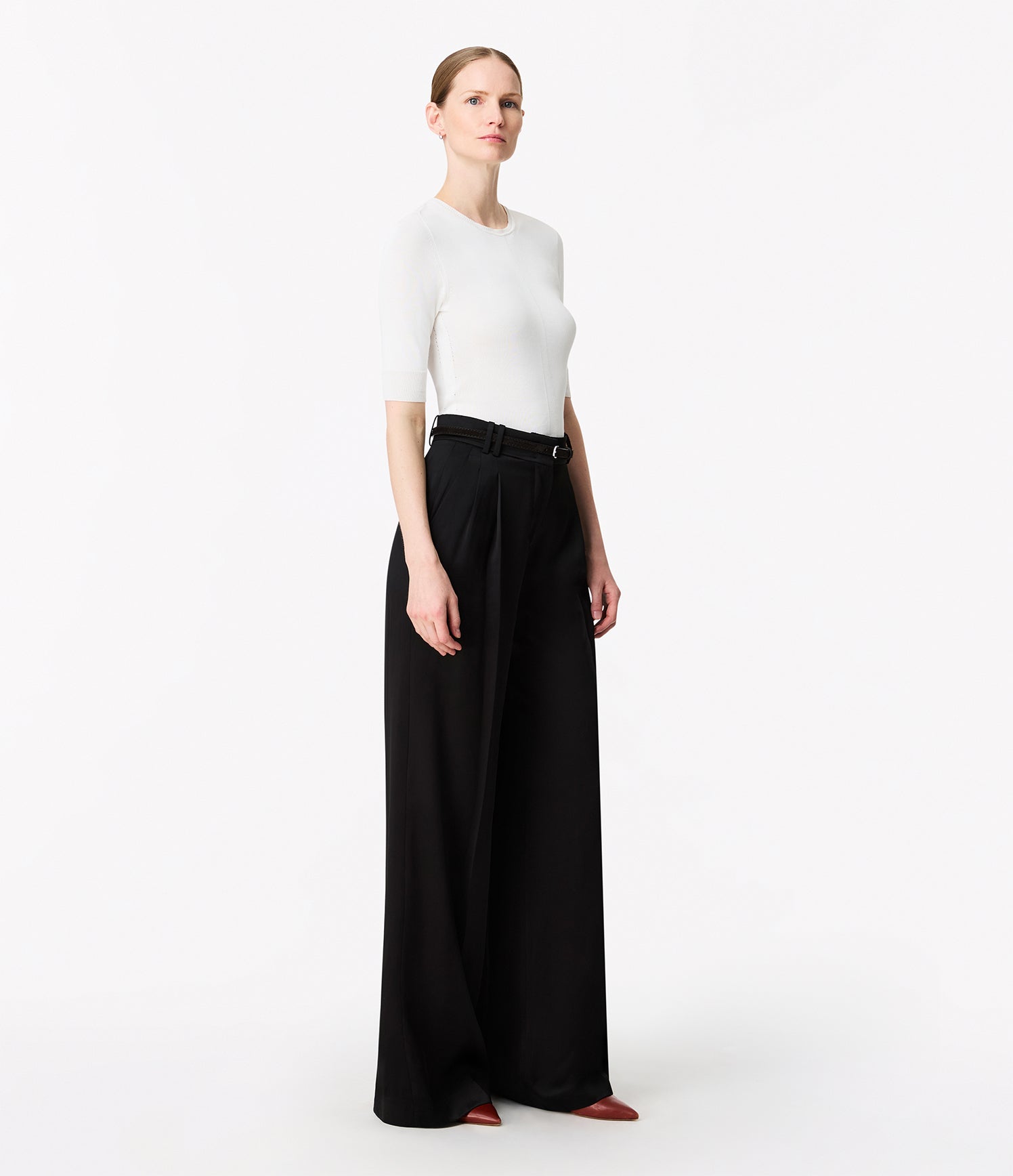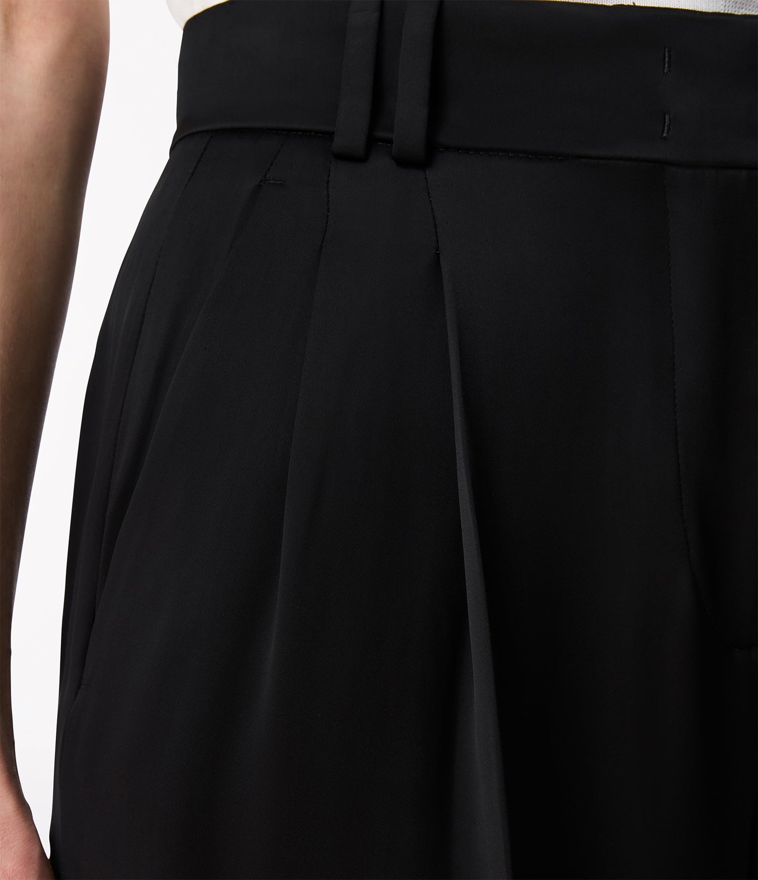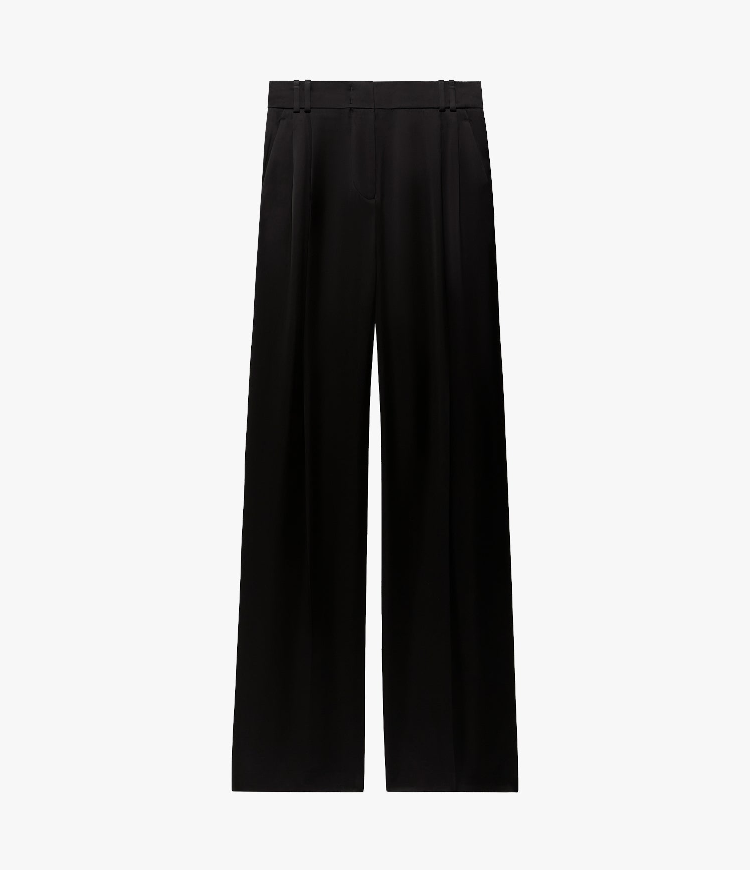 Fluid and refined, the Satin Pleated Trouser is tailored from luxuriously soft satin that drapes with ease and quiet sophistication. Cut to sit high on the waist with a wide, pleated leg, it creates a long, elegant line that transitions seamlessly from day to night. Front slant pockets and self-covered buttons at the back lend subtle detail without distraction. Pair it with a silk blouse for evening polish, or a crisp white shirt for a timeless, modern uniform.