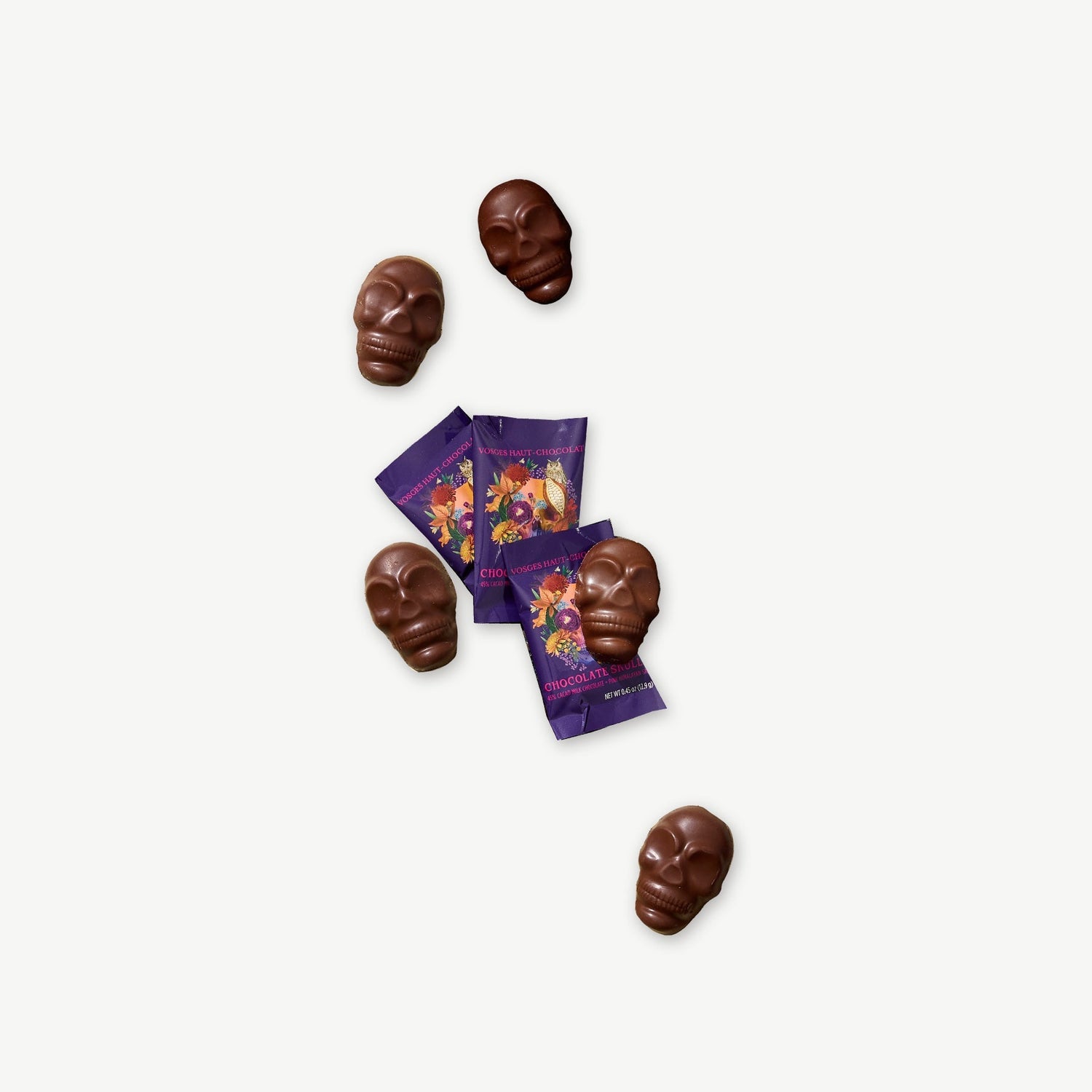 Inspired by the vibrant traditions of the Day of the Dead, these individually wrapped skull-shaped treats honor the festival's playful and profound spirit. A decadent fix for the chocolate craving, these skulls are made with our proprietary 45 percent cacao deep milk chocolate, blended with gentle, slightly sweet pink Himalayan salt giving the chocolate a floral finish and a little bit of crunch to evoke childhood memories of your favorite spooky candy. Old-fashioned tradition meets slight obsession.