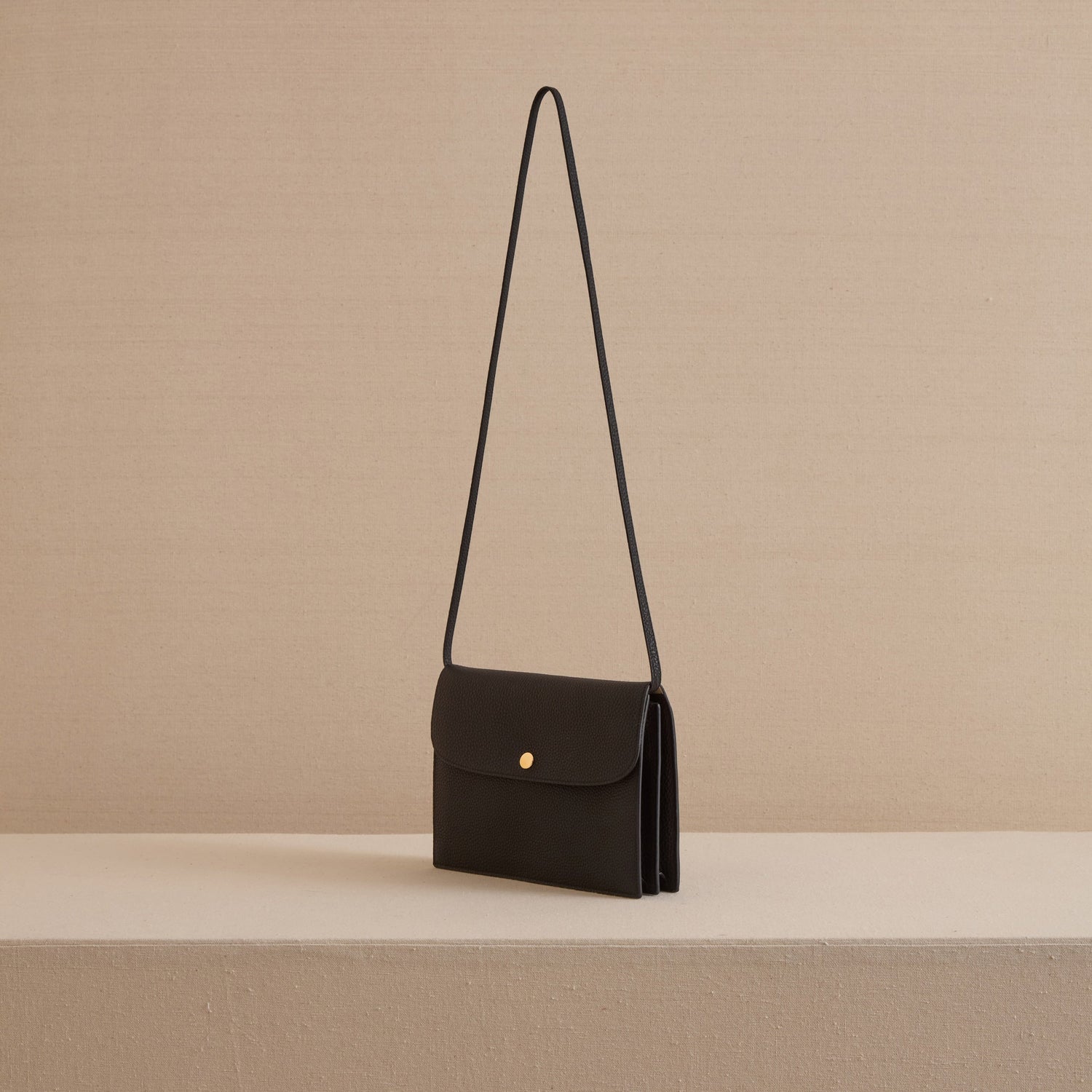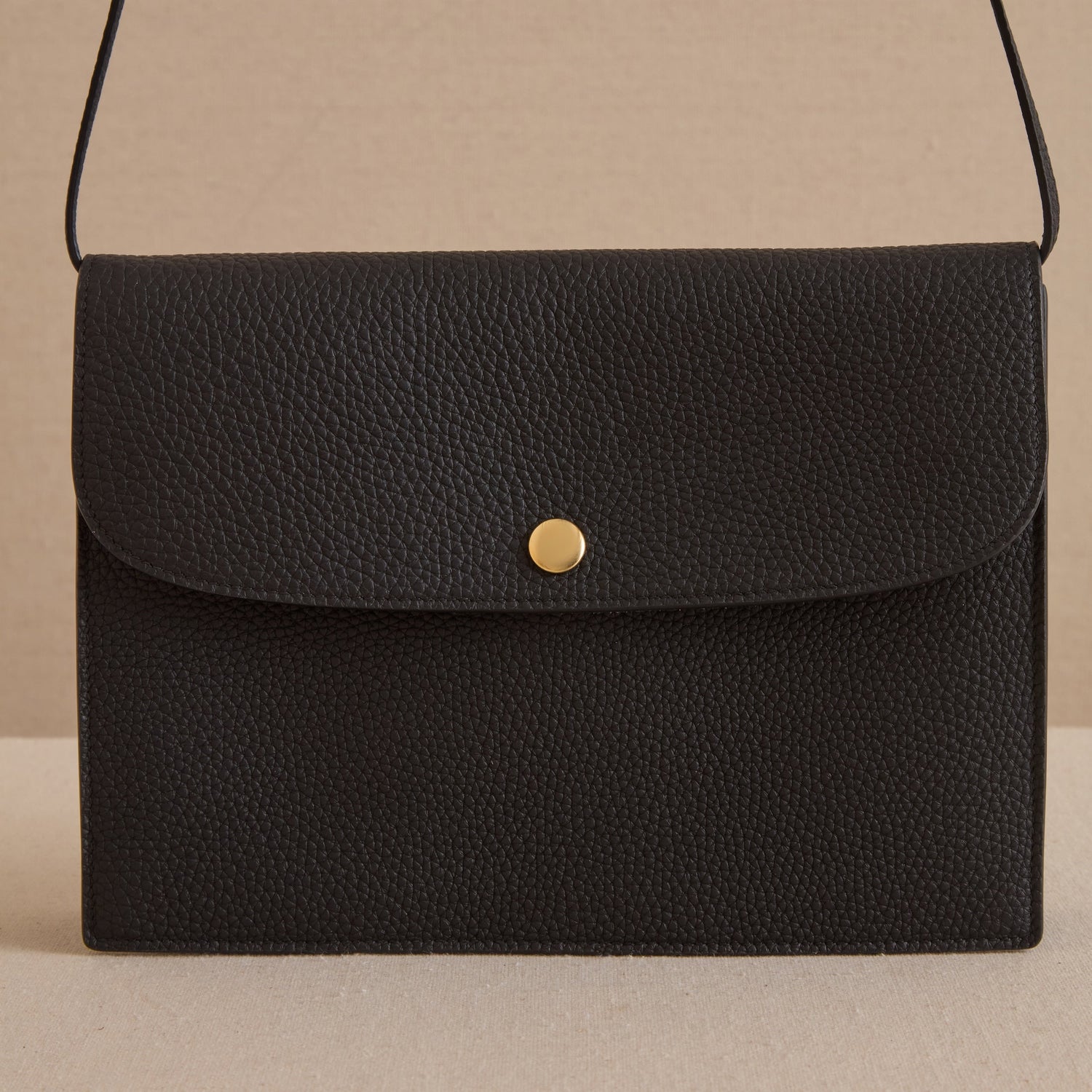 Handmade in tumbled grain leather, this adaptable accessory transitions seamlessly from crossbody to clutch with removable straps. The practical snap closure and refined goatskin lining deliver function with elegance. Whether worn across the body, carried as a statement clutch, or used as a sophisticated organizer within your tote, the Skip Pouch is the essential companion for the modern woman's ever-changing day.
