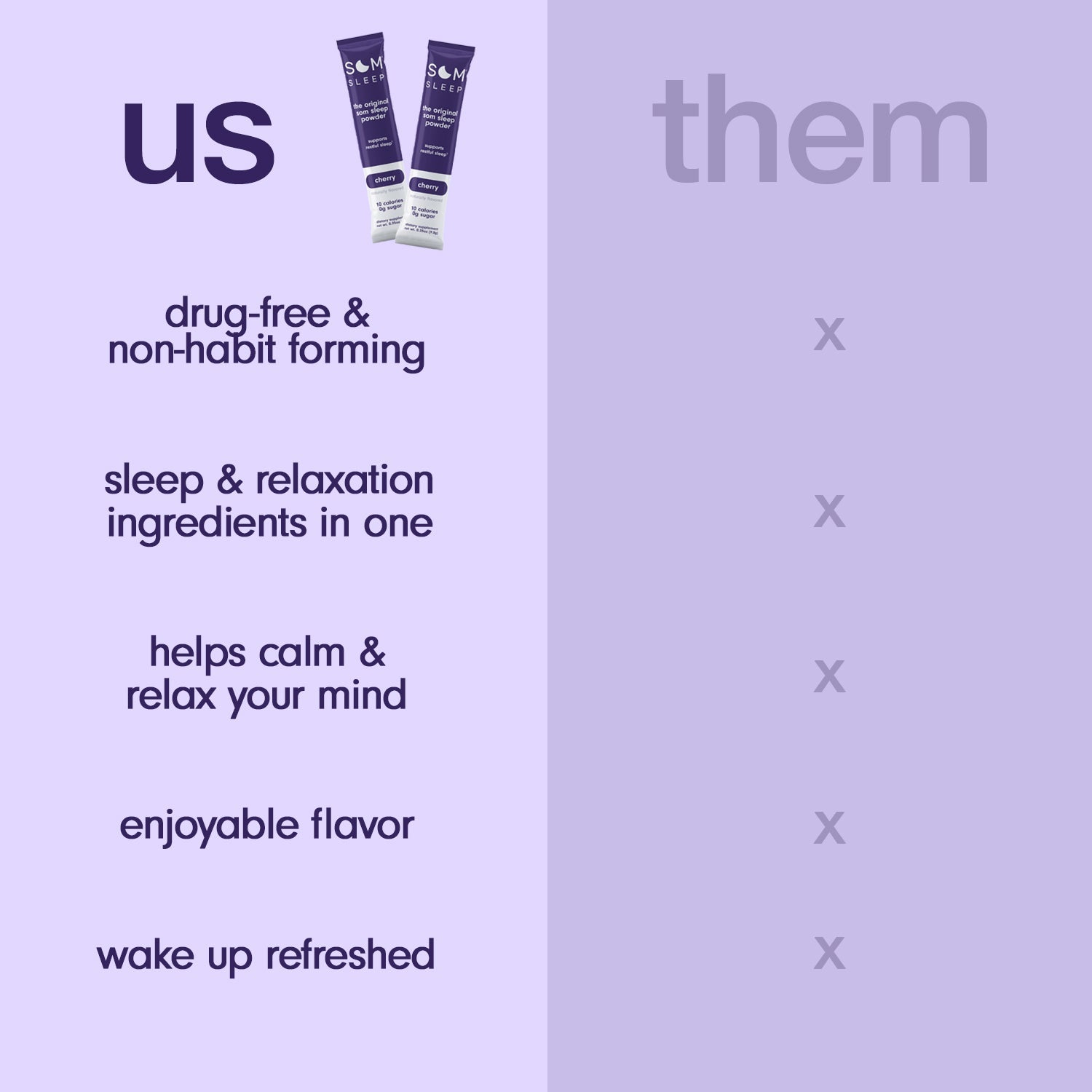 Unlock restful nights anywhere with Som Sleep's Cherry Powder Drink Mix. Each stick pack is formulated with science-backed ingredients to help you fall asleep quickly and wake up feeling refreshed—no grogginess, no hassle. Just mix with water and drink 30 minutes before bed to experience deeper, more restful sleep. With a smooth cherry flavor, zero sugar, and only 10 calories per serving, it's a simple, travel-ready solution for better sleep anytime, anywhere.