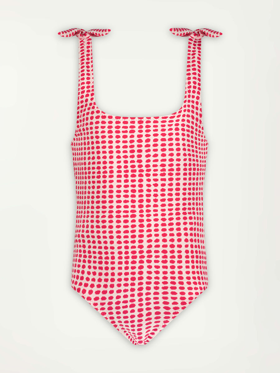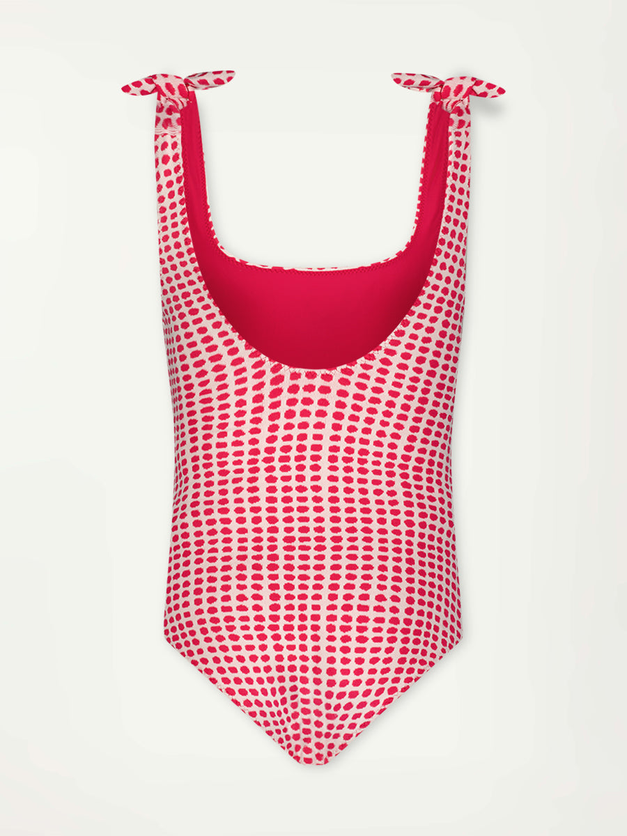 The Sisay One Piece showcases vibrant raspberry dots on an ivory background, adding a lemlem twist to the classic gingham pattern. The textured stretch fabric on the outside and the silky pink lining inside provide a unique fit. Crafted with lemlem jacquard fabric, this suit is perfect for your little one's summer adventures.