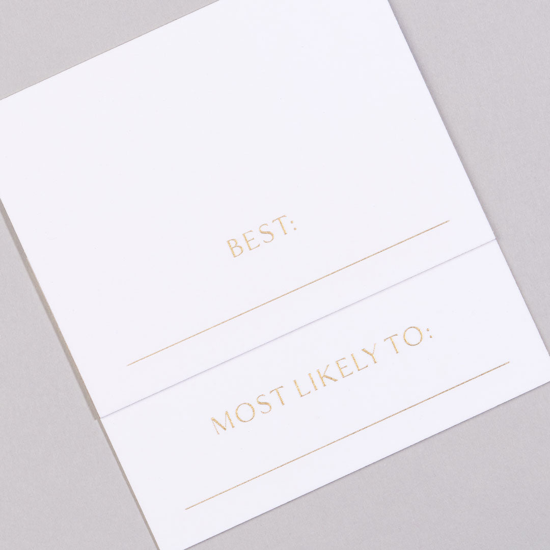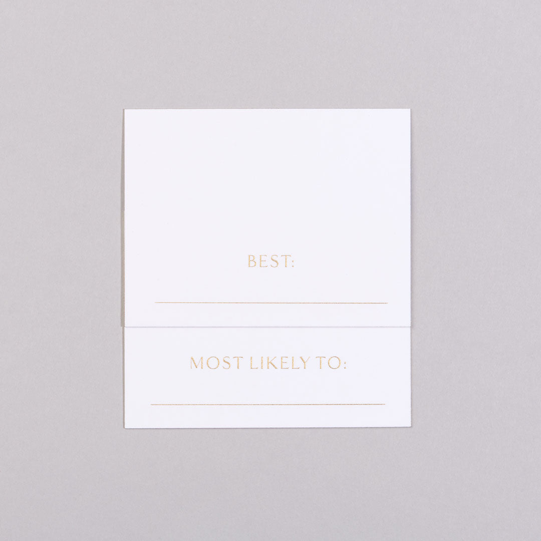 What better way to start a beautiful evening (and some lively conversation) than with a little awards ceremony? Dear Annabelle's Superlatives Place Cards let you honor each of your guests with a "best" or "most likely to" accolade, like BEST kisser / blowout / dressed / cheekbones, or MOST LIKELY TO finish the wine / push for karaoke / post food pics / get naked.