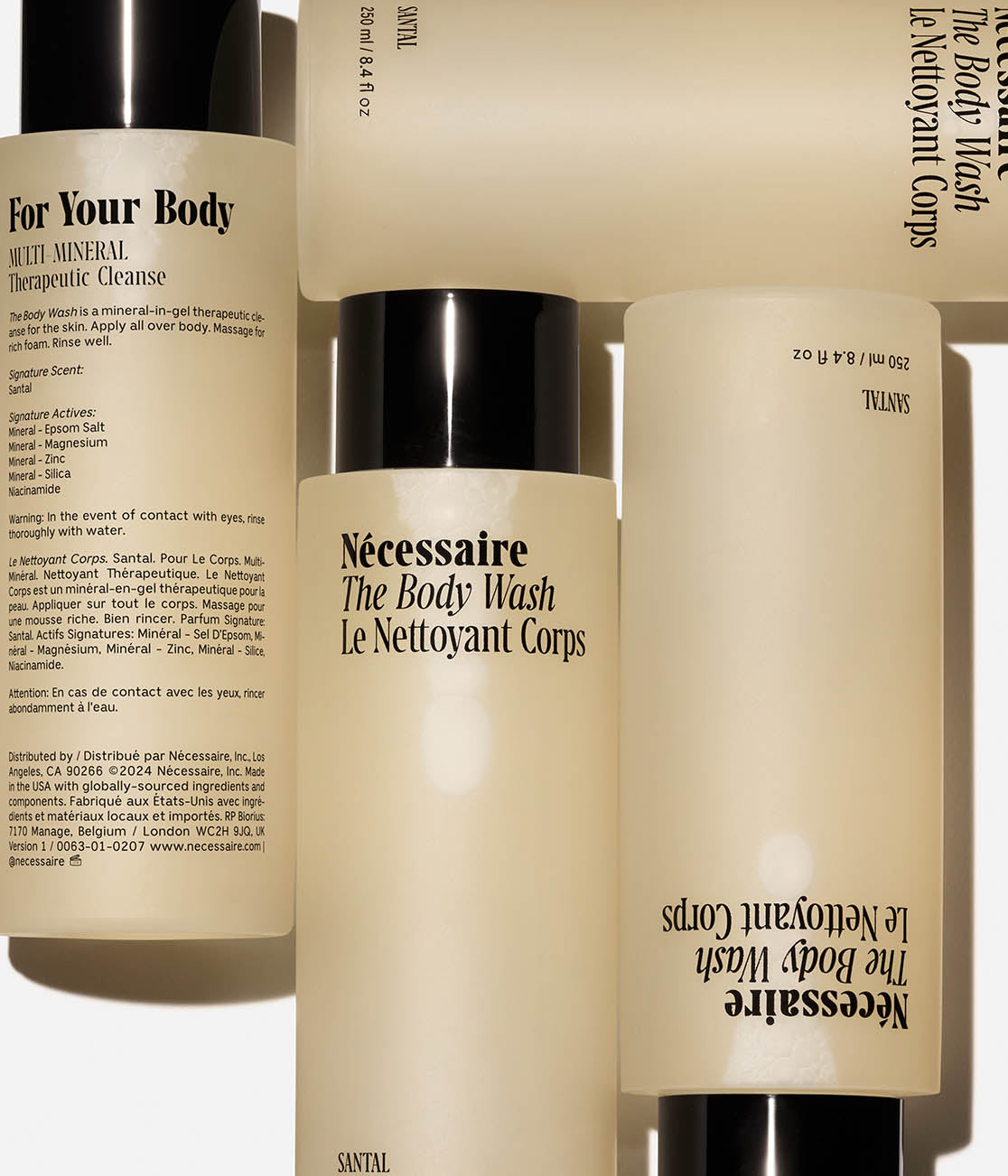 The Body Wash Santal is a restorative treatment cleanse for skin. A proprietary liquid delivery of Epsom Salt and Minerals (Magnesium/Zinc/Silica) deeply restore depleted skin, while Niacinamide helps support the skin's protective barrier. The signature scent of Santal pairs Pure Essential Sandalwood Oil with Fine Fragrance notes of Black Pepper, Iris and Jasmine for a warm and woodsy experience. The iconic texture is built on glycerin, making the formula non-stripping, non-drying and comforting. No SLS / SLES. Dermatologist-Tested. Hypoallergenic. Non-Comedogenic. Vegan.