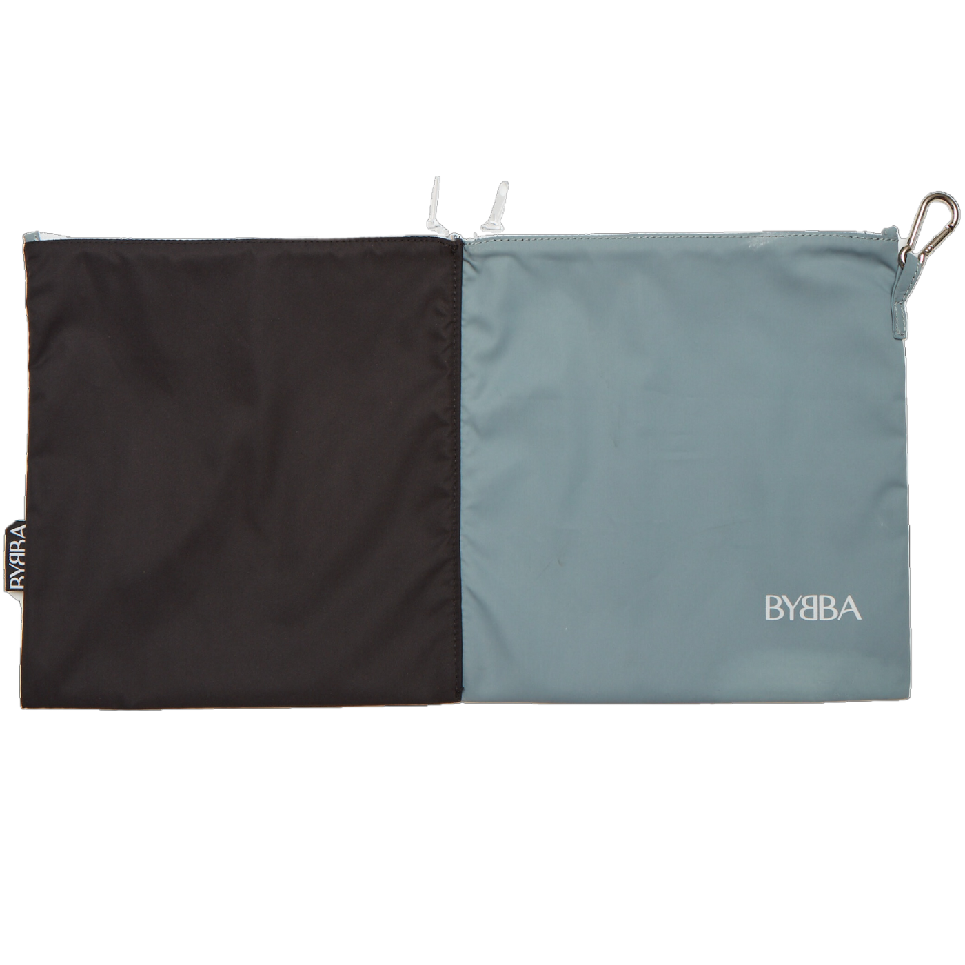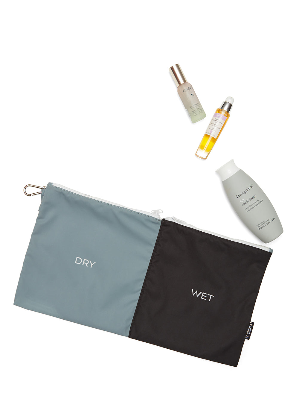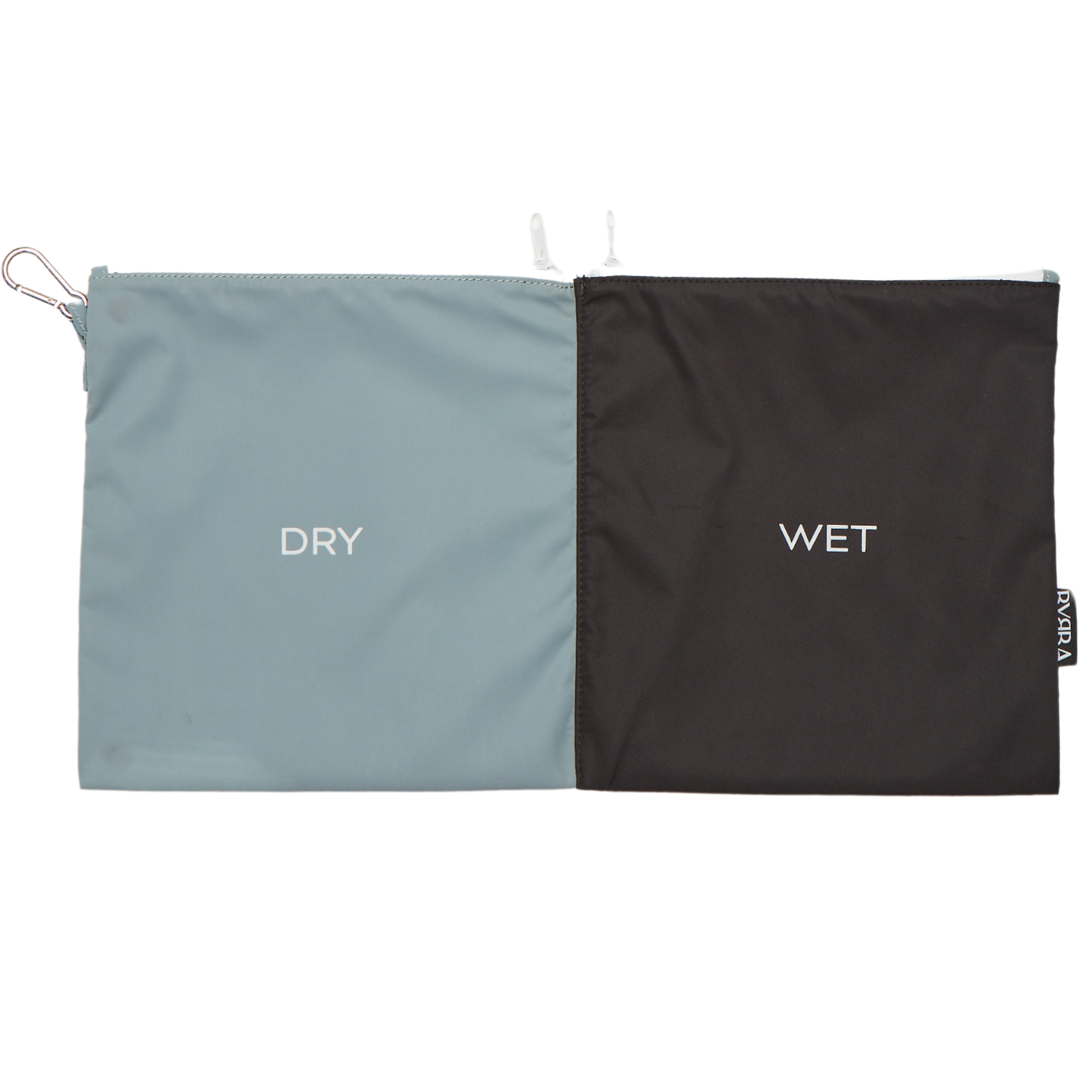 The all-new Wet/Dry Pouch is a versatile, two-sided essential for everyday travel. Made with a durable Techniluxe™ outer shell and water-repellent lining, it features two separate compartments with waterproof interiors and neon zippers. Hidden magnets offer a sleek closure, making it easy to ditch single-use baggies. Perfect for gym gear, damp swimsuits, or parenting on-the-go. One side is black, the other blue-gray.