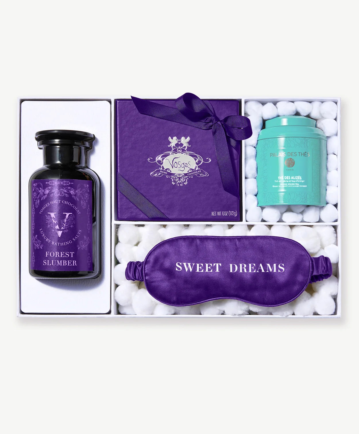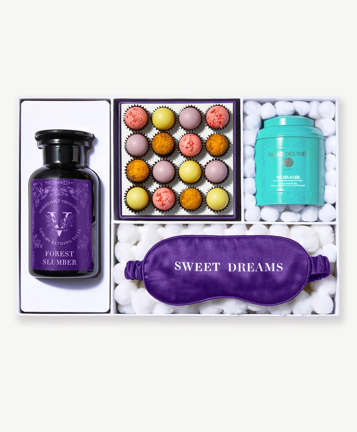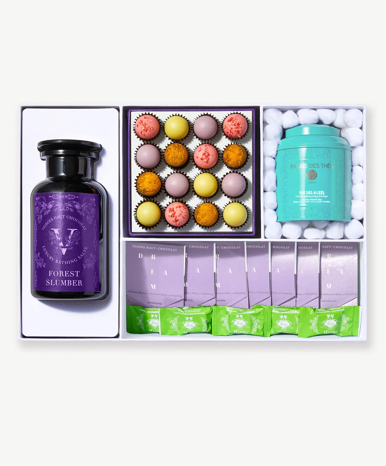 Introducing the Dream Experience - Chocolates for Luminescent Sleeping and Dreaming. A curated selection of chocolates and accoutrements to designed to enhance luminescent sleep. Featuring a 16 piece Dream truffle collection, Dream Cocoa Butter Mini Chocolate Bars, Matcha Mini Petites, Forest Bath Salts, Silk Sleep Mask and a tin of Palais de The loose leaf tea.