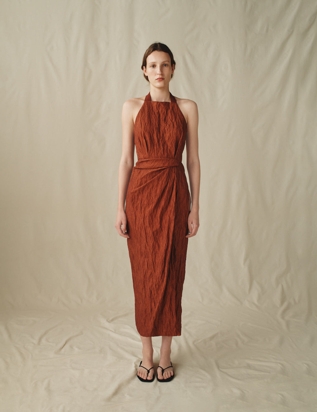 In a breathable cotton-linen blend with a crinkled finish, this dress features a slim fit and a hand-draped skirt for soft definition at the waist.