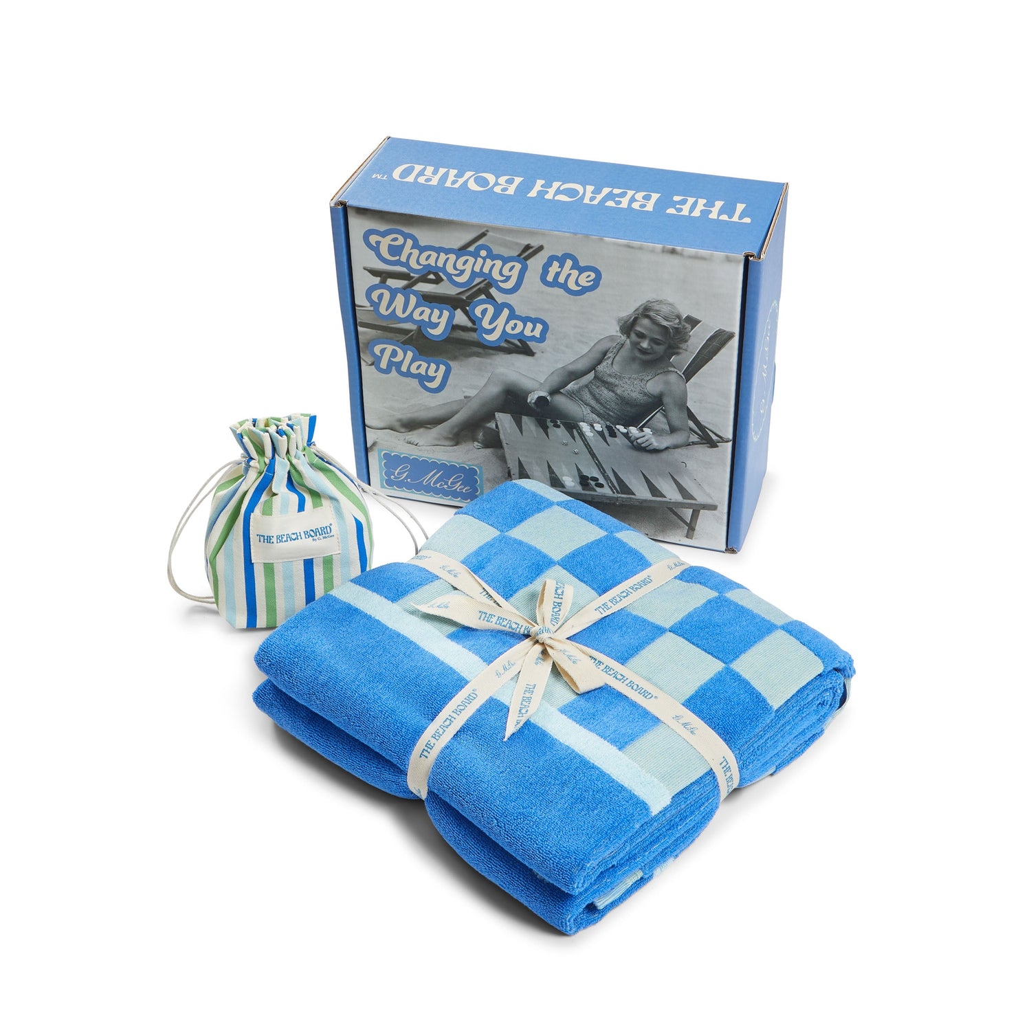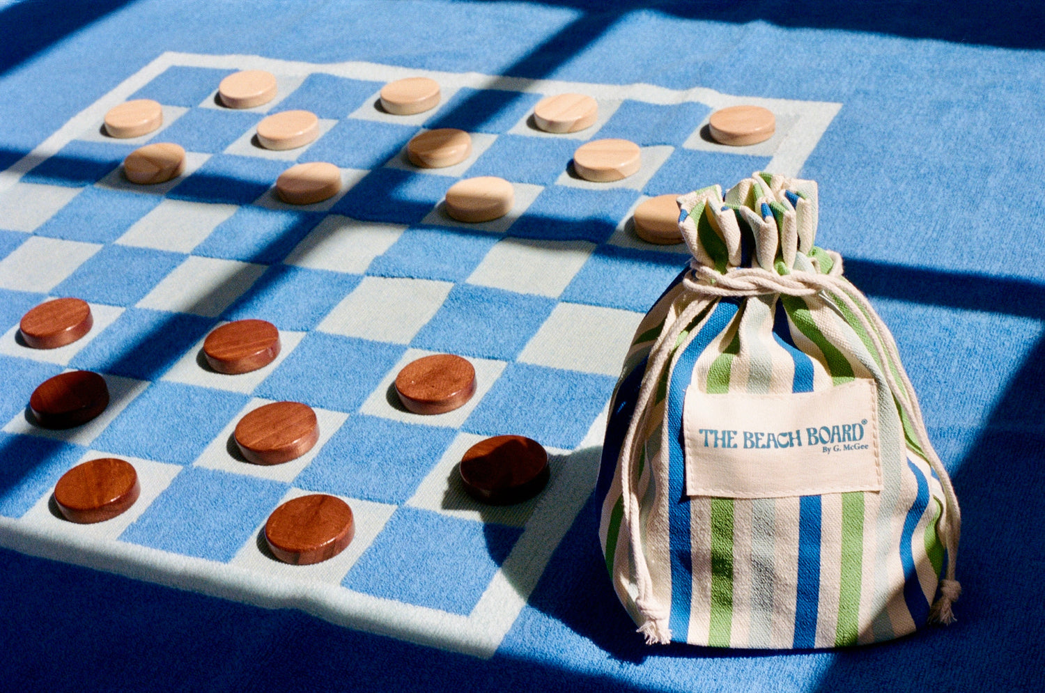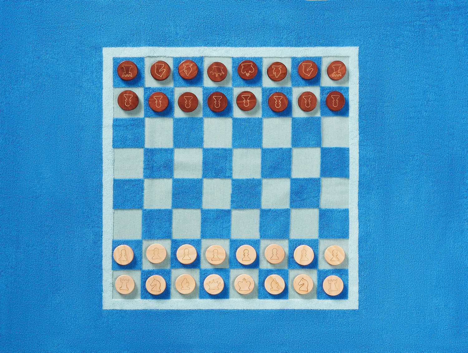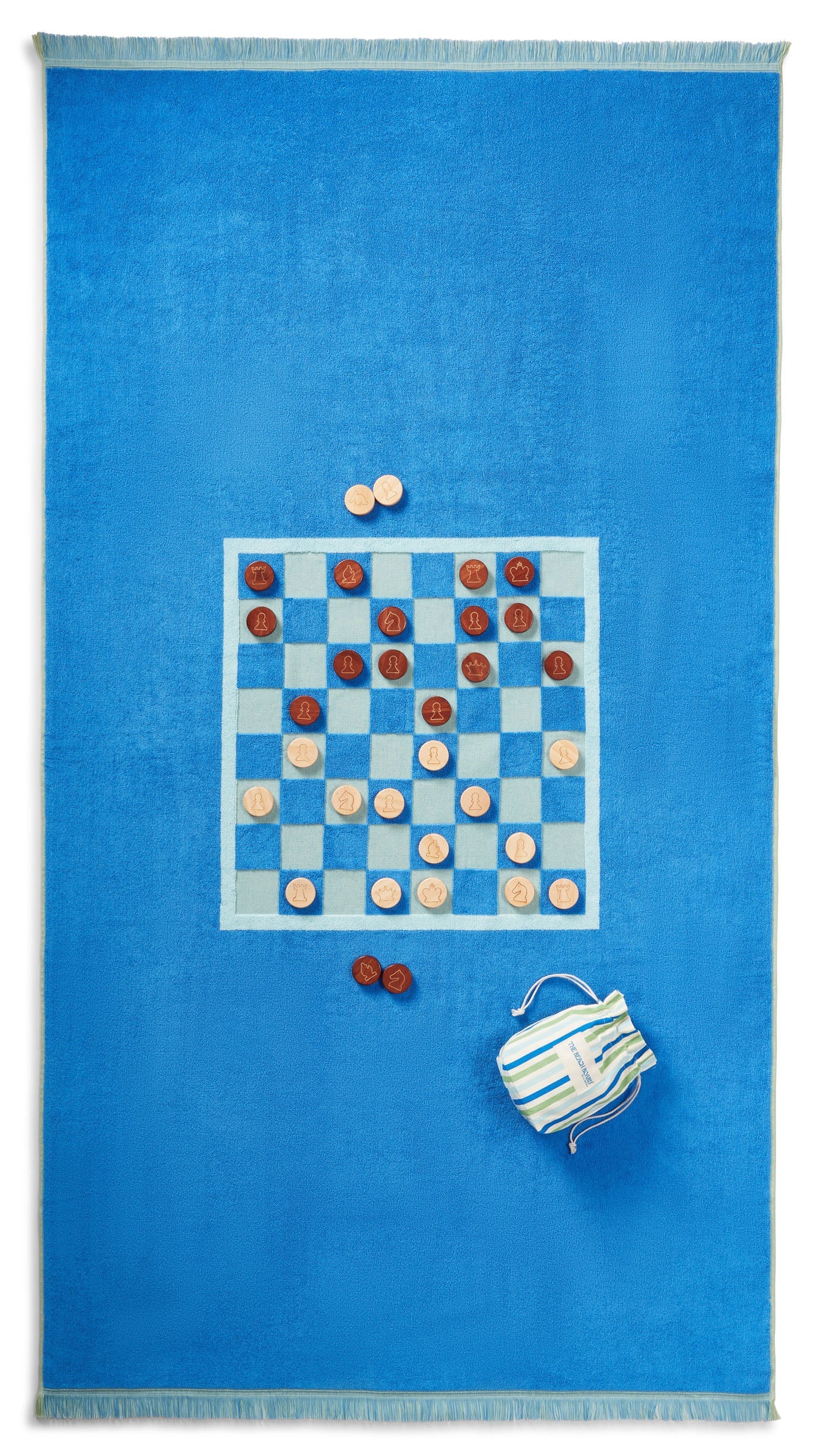 Our luxury, oversized, bold-colored products are woven with plush cotton terry. Each product comes with a matching canvas pouch containing light and dark wood game pieces. Our pieces were designed to be the perfect weight - light enough not to burden your load, and heavy enough not to blow away.