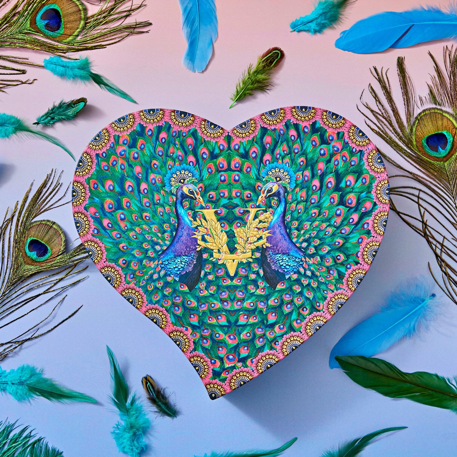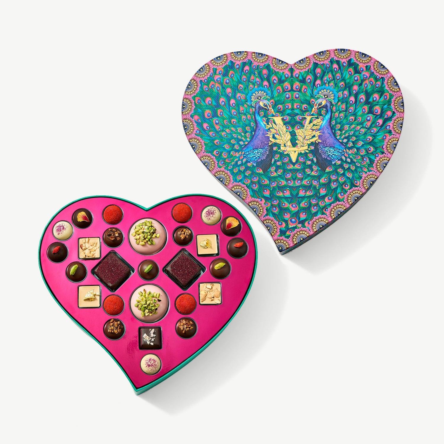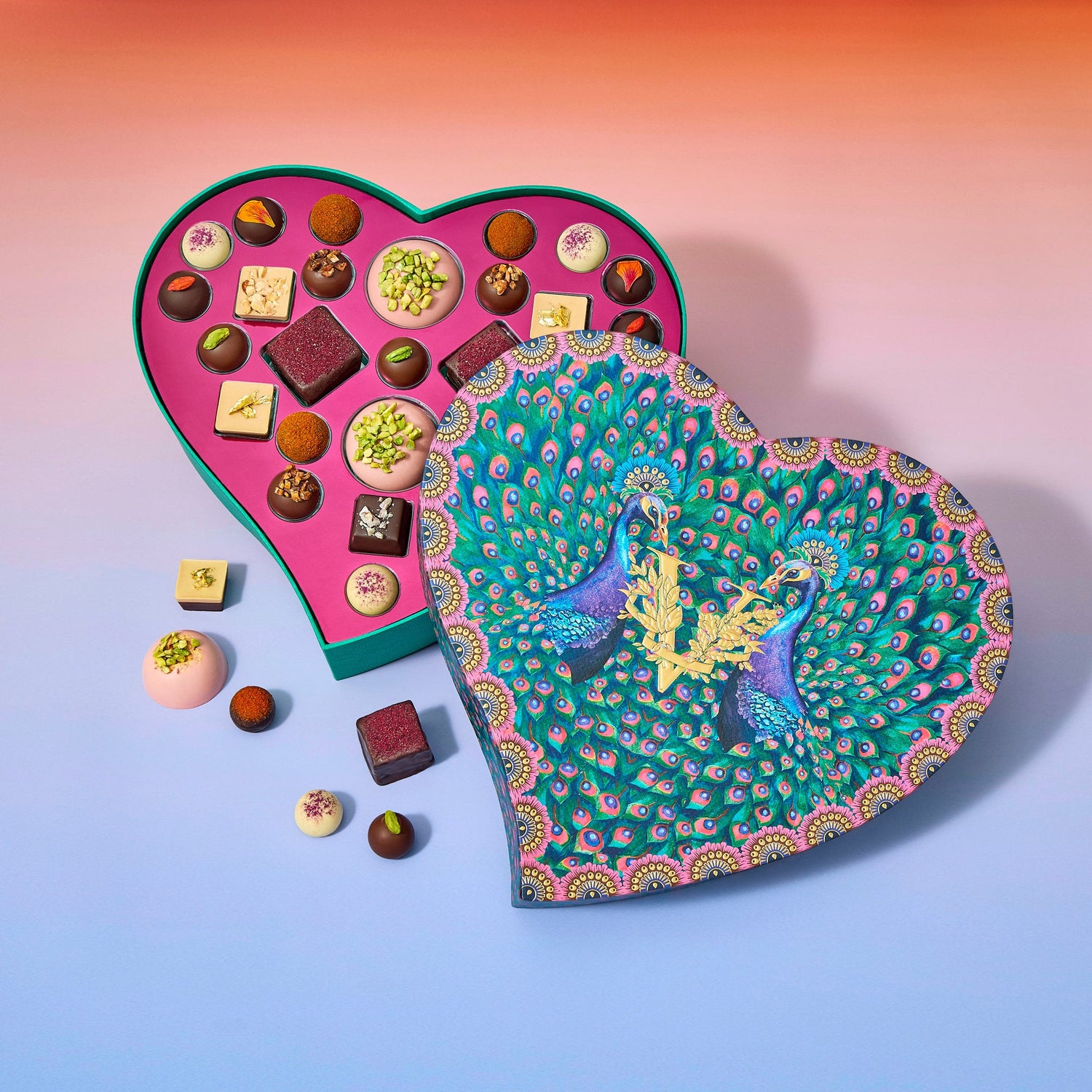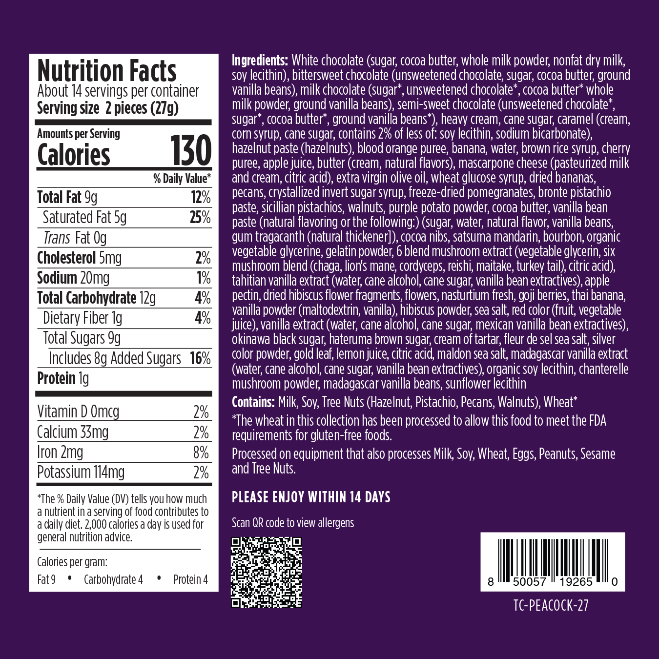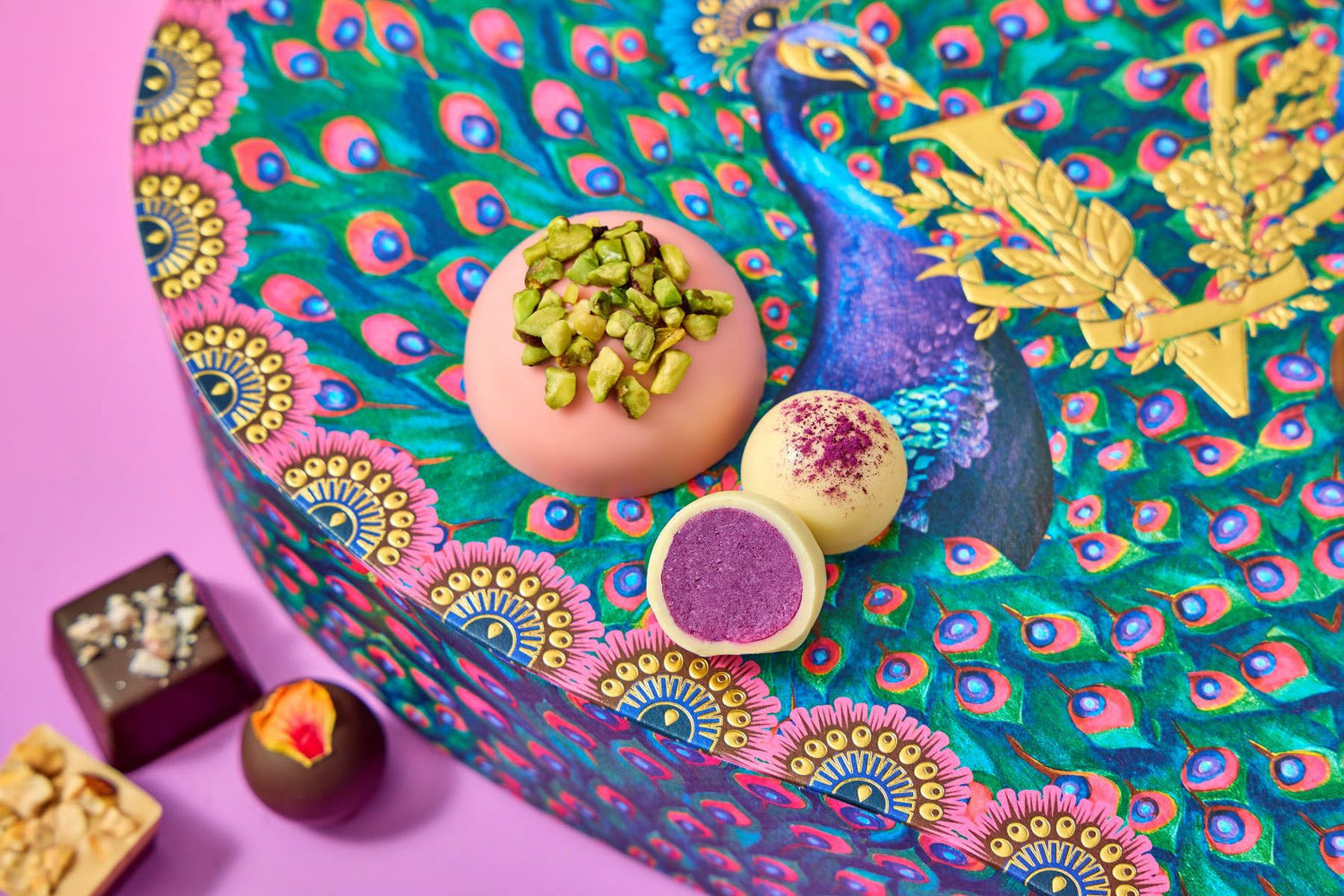 Experience a kaleidoscope of parfums inspired by the vibrant beauty of the peacock with Vosges' 27-piece truffle collection. Each truffle celebrates nature's boundless artistry, weaving together sweet and earthy Japanese ube, the nutty richness of Sicilian pistachio, the lush sweetness of pomegranate, the indulgence of hand-cut gianduia layers, and the delicate allure of Bourbon Island vanilla and blood orange caramel marshmallows.