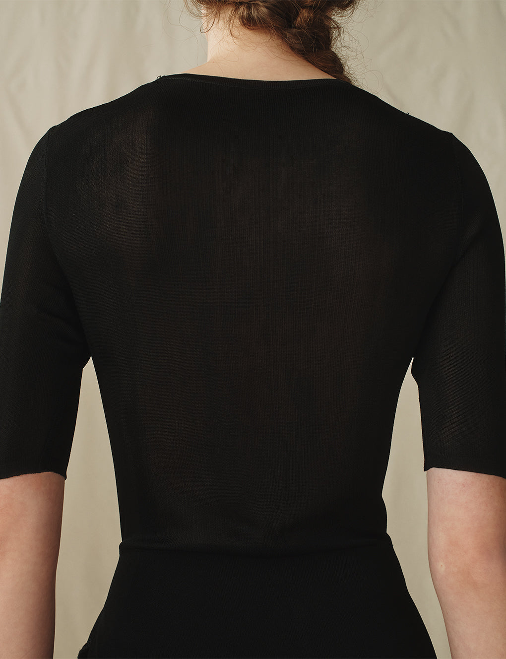 The Porto Dress is crafted from a fine, sheer viscose knit that gracefully skims the body. Its sheer knit top reveals a hint of skin, while the opaque wrap skirt provides more coverage. Pair it with The Evening Wrap for additional coverage.