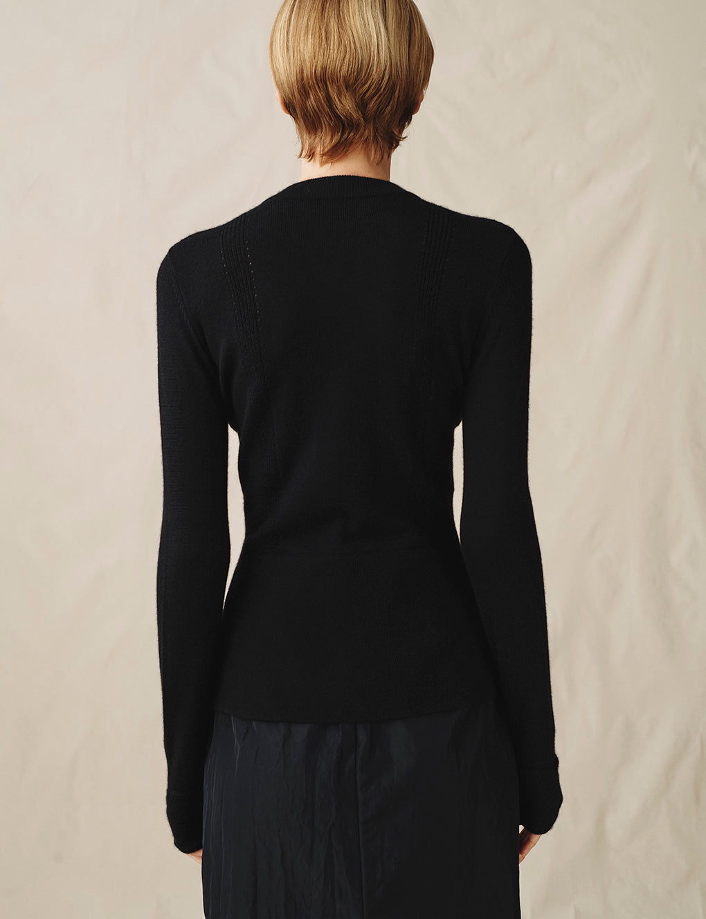 In a soft, cashmere-silk blend, this cardigan features a cutaway shape at the waist for a fitted and slightly sculptural silhouette. Finished with hand-stitched details and tonal velvet buttons.