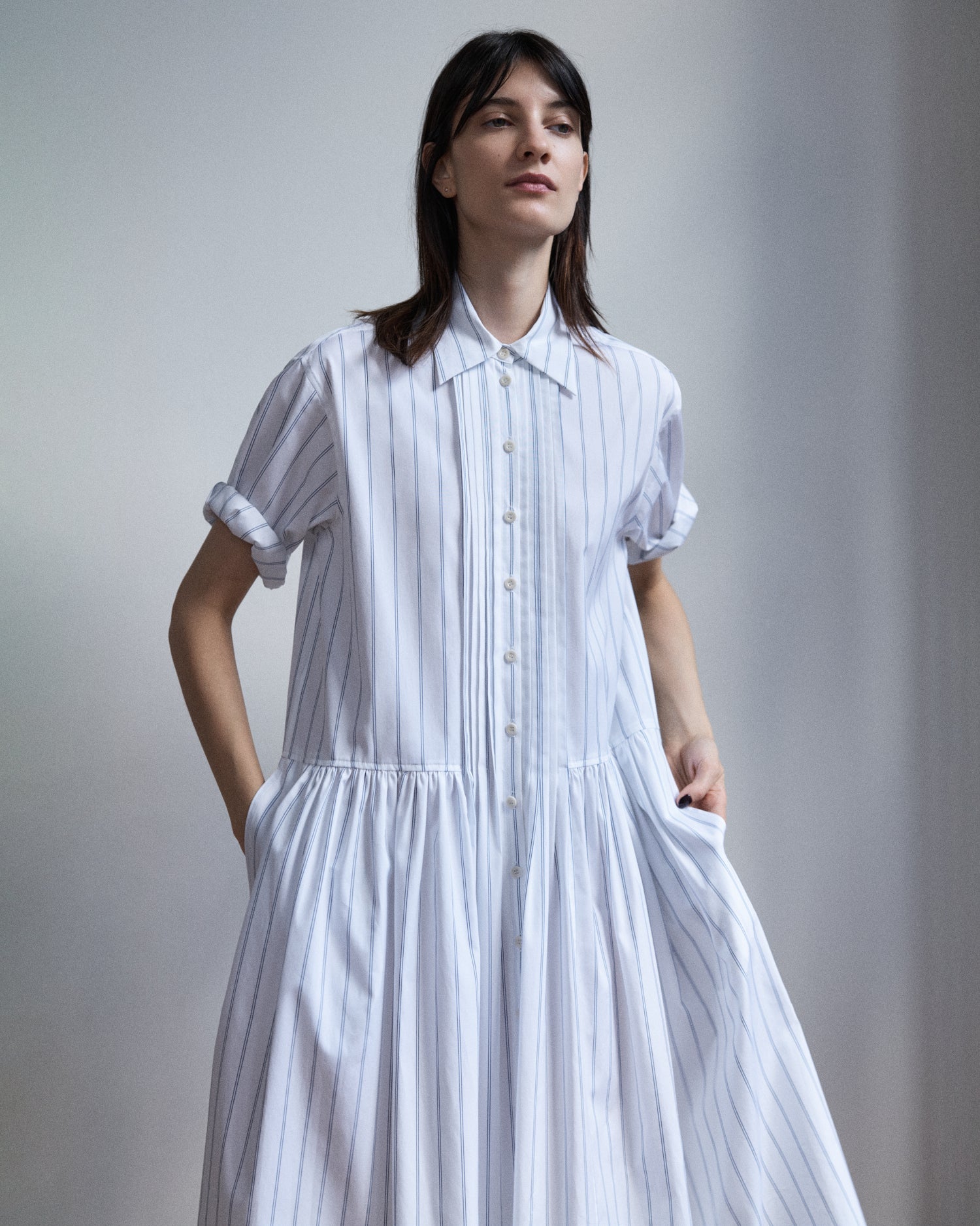 Classic point collar and crisp tucks framing the tiny corozo buttons that open to the hem.
