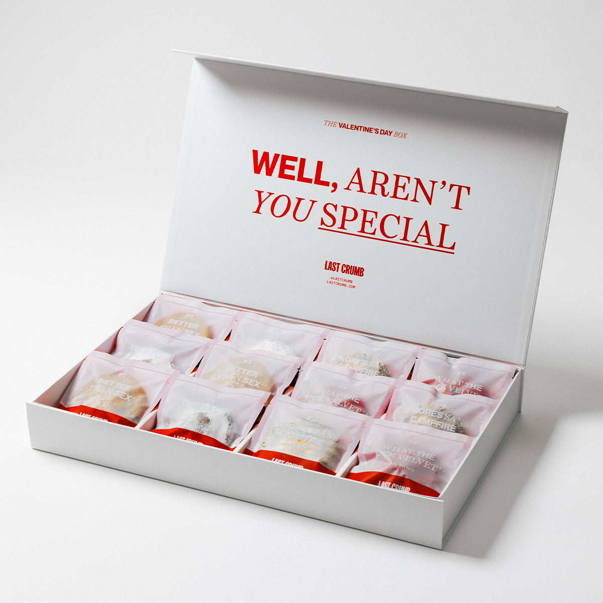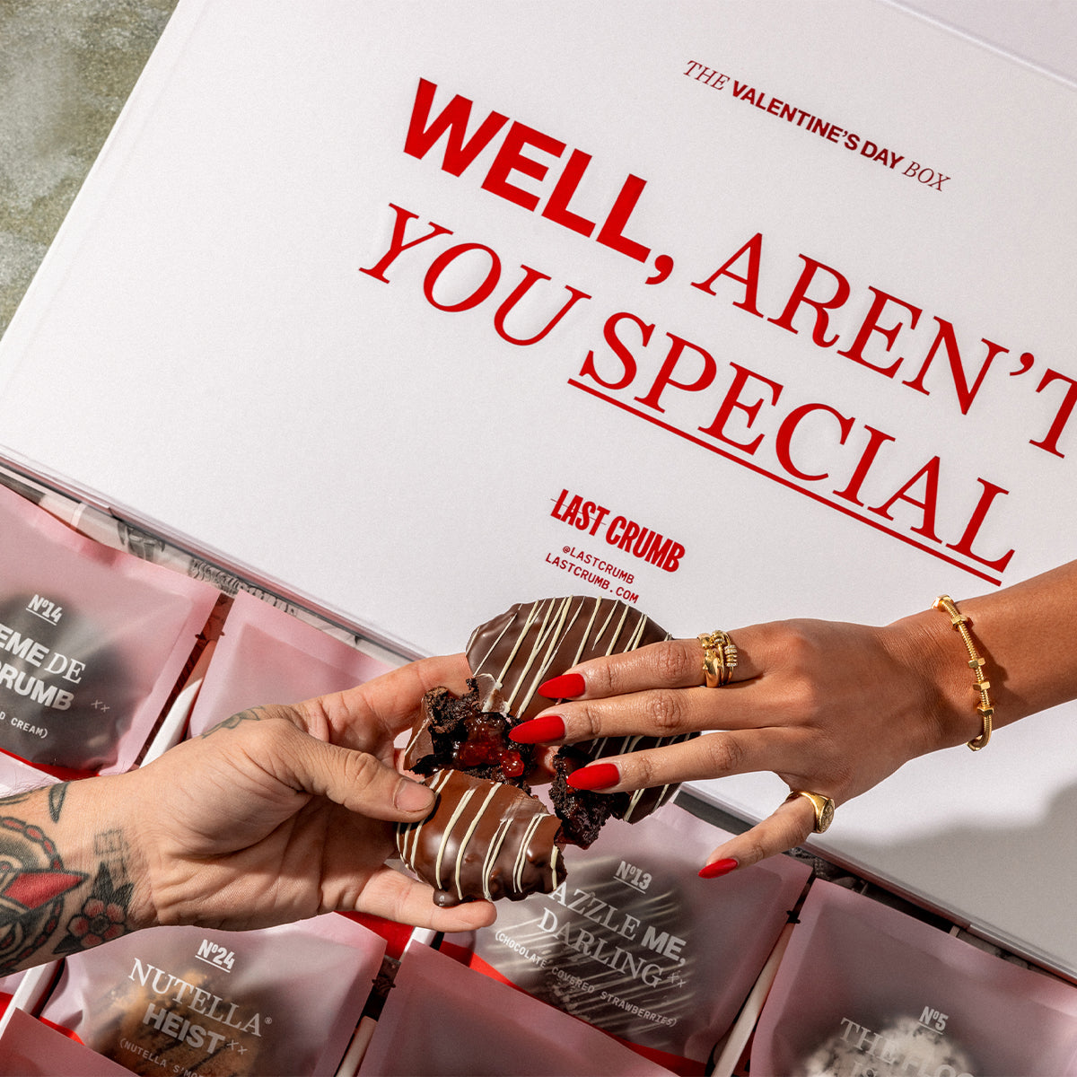 A dozen roses might get you a kiss. A card for a hug. But let's be real, you want more. Give them Last Crumb and delight as they undress us. Their eyes, burning with desire, dance over Last Crumb's palate-seducing curves — 12 decadent cookies, individually wrapped for your pleasure. Mouth-watering flavors so seductive they'd make Aphrodite blush. Each bite, more lascivious than the last. Cancel the reservation — this is what foreplay tastes like.