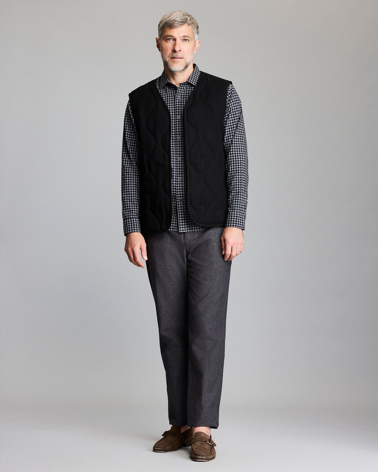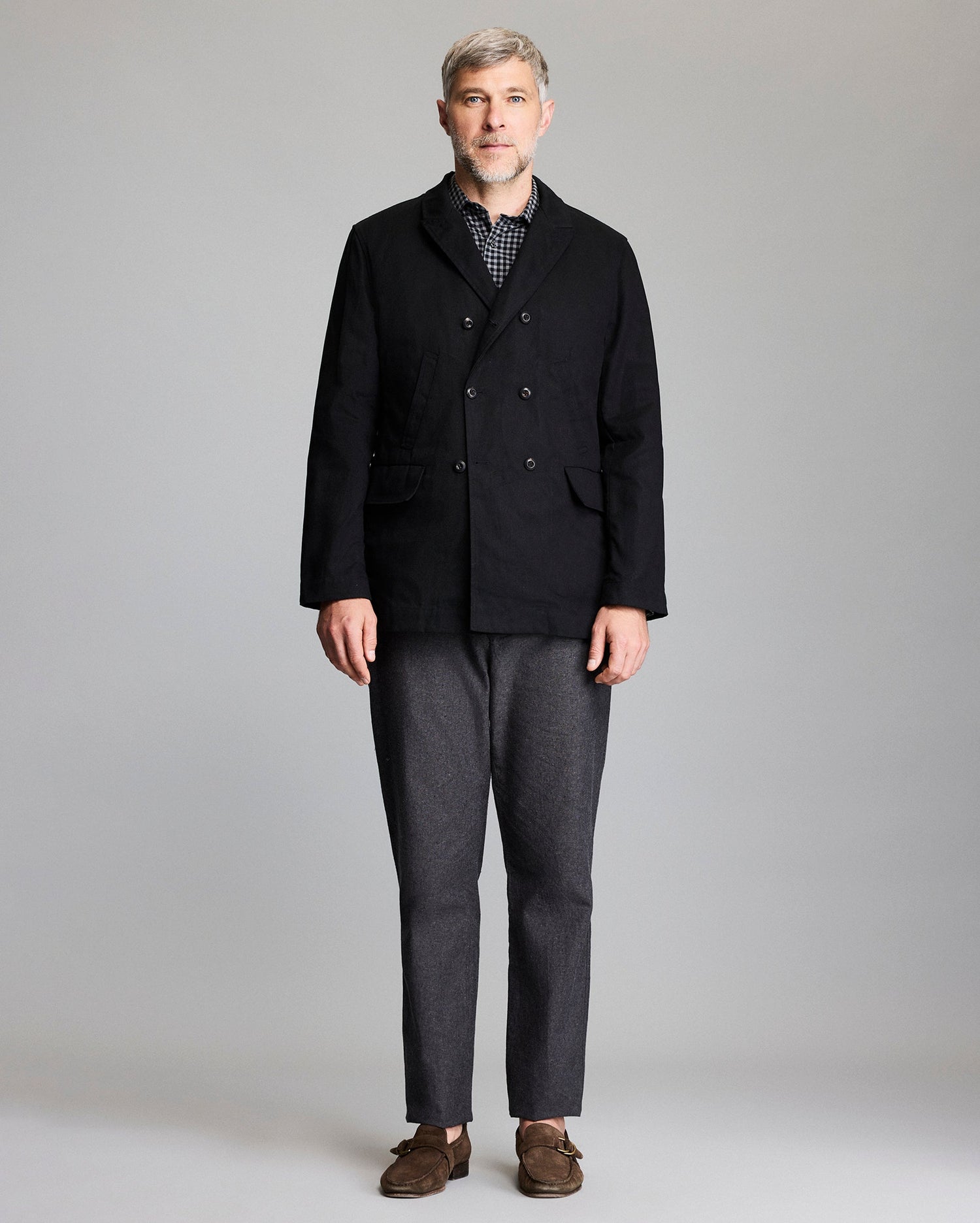 The Waxed Canvas Bond Peacoat reimagines a Billy Reid icon with rugged, weather-ready refinement. Cut in the same sharp silhouette as the original, this version is crafted from a special waxed canvas developed by Halley Stevensons in Scotland and features a detachable quilted liner that buttons easily on and off. Rain resistant and wind cutting, it's engineered to perform in the elements while retaining the elegance that made the Bond Peacoat a modern classic. Made famous by Daniel Craig in Skyfall—it's finished with genuine horn buttons and the signature heirloom ribbon tab at the back of the collar.