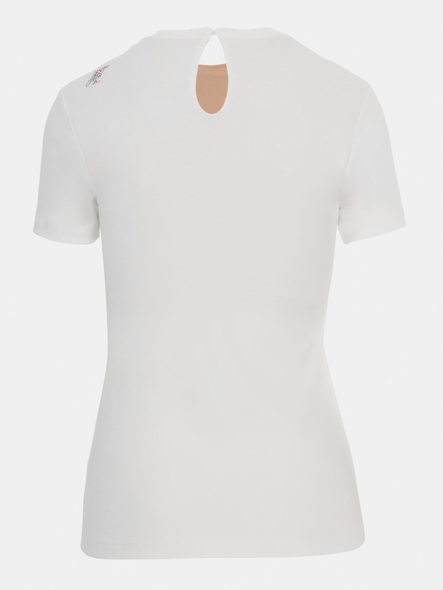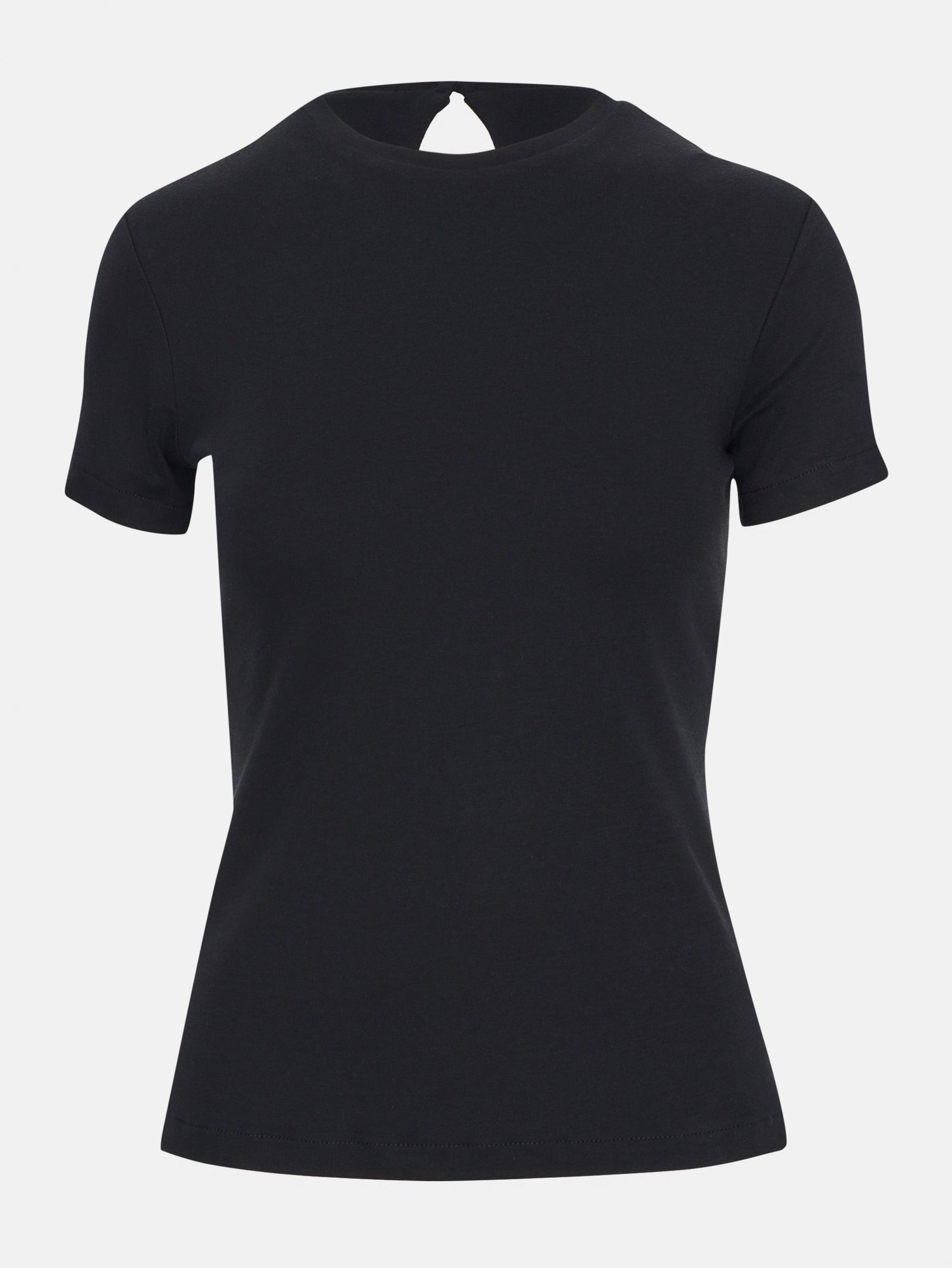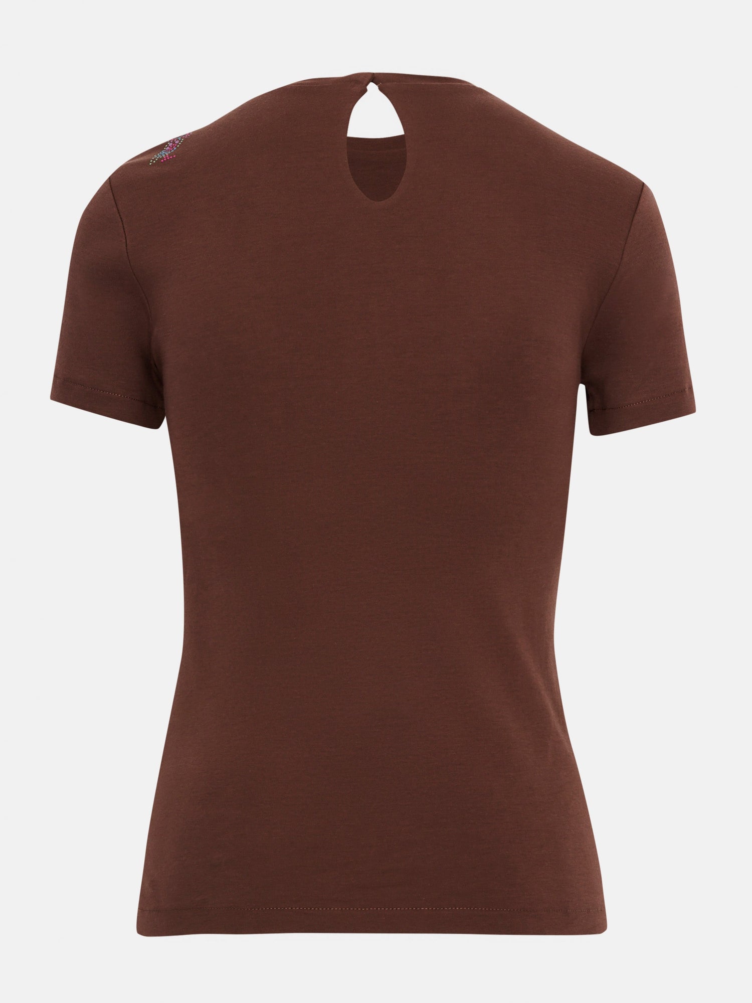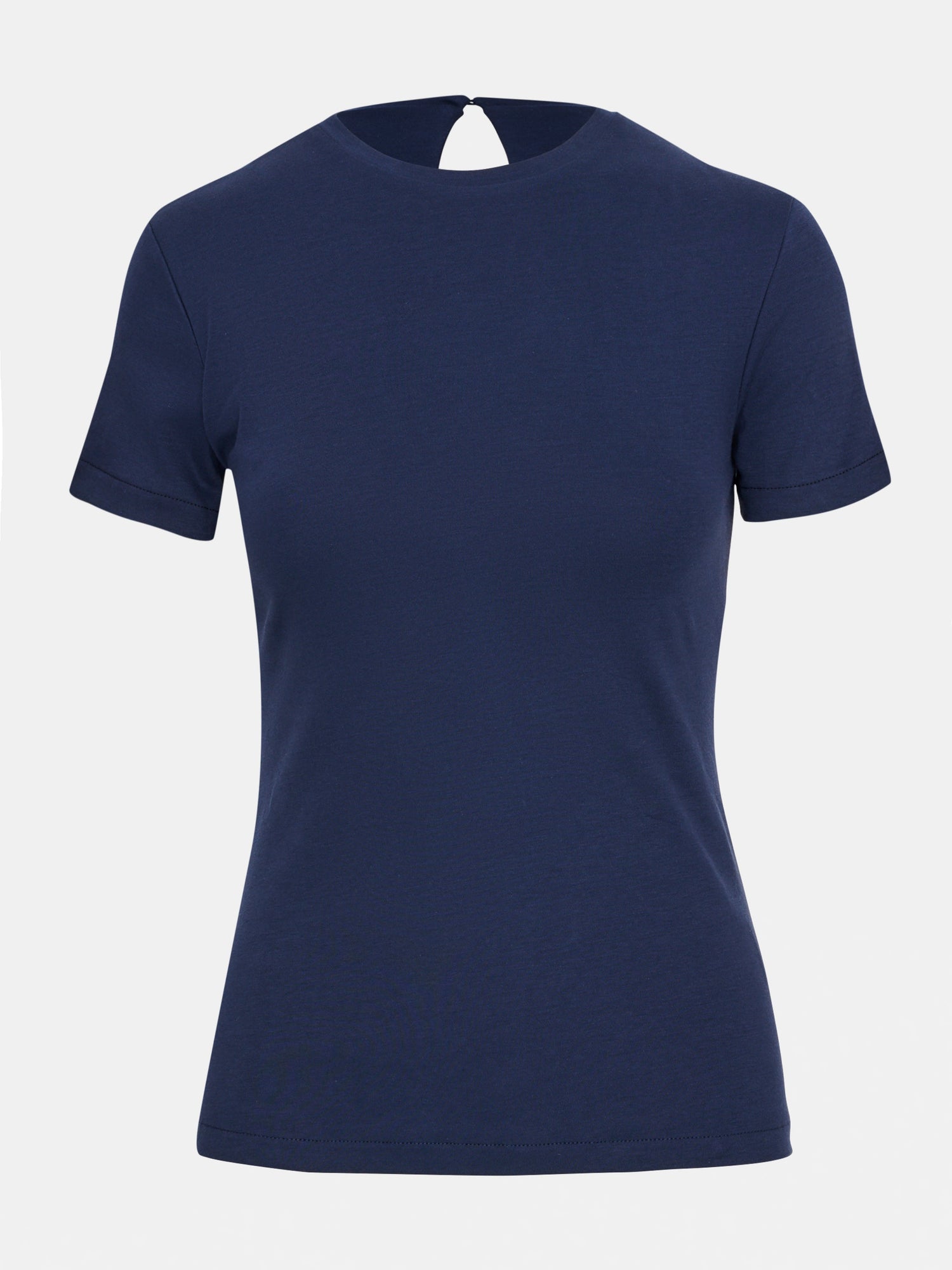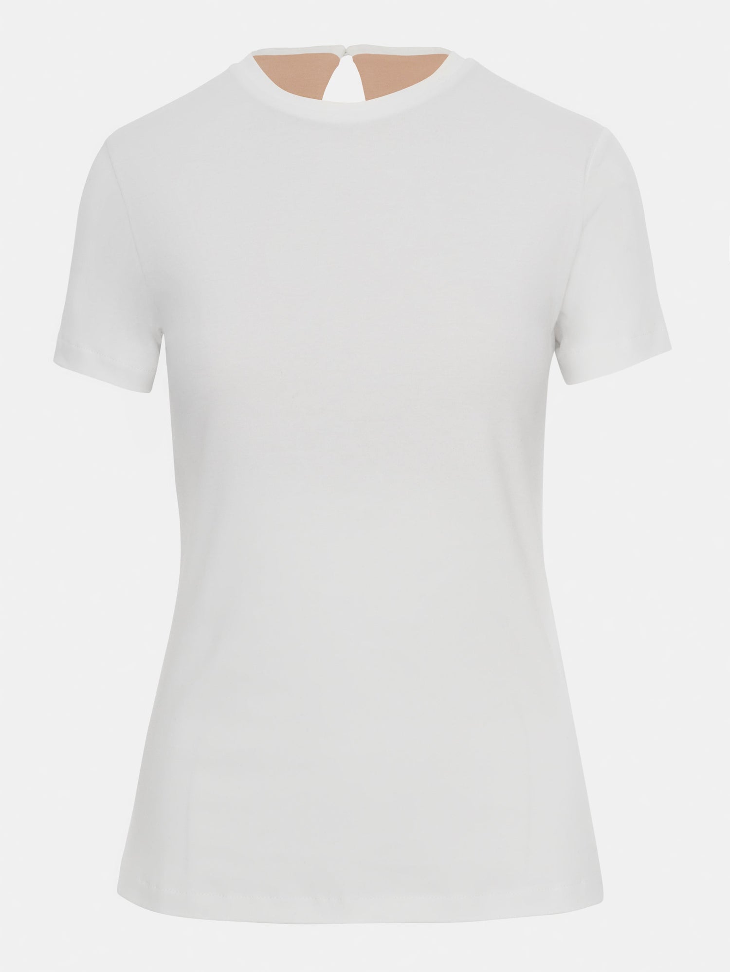 An elevated staple, Who's Crewneck T-Shirt comes with an internal shelf bra, pearl button closure, and jewel-shaped keyhole.